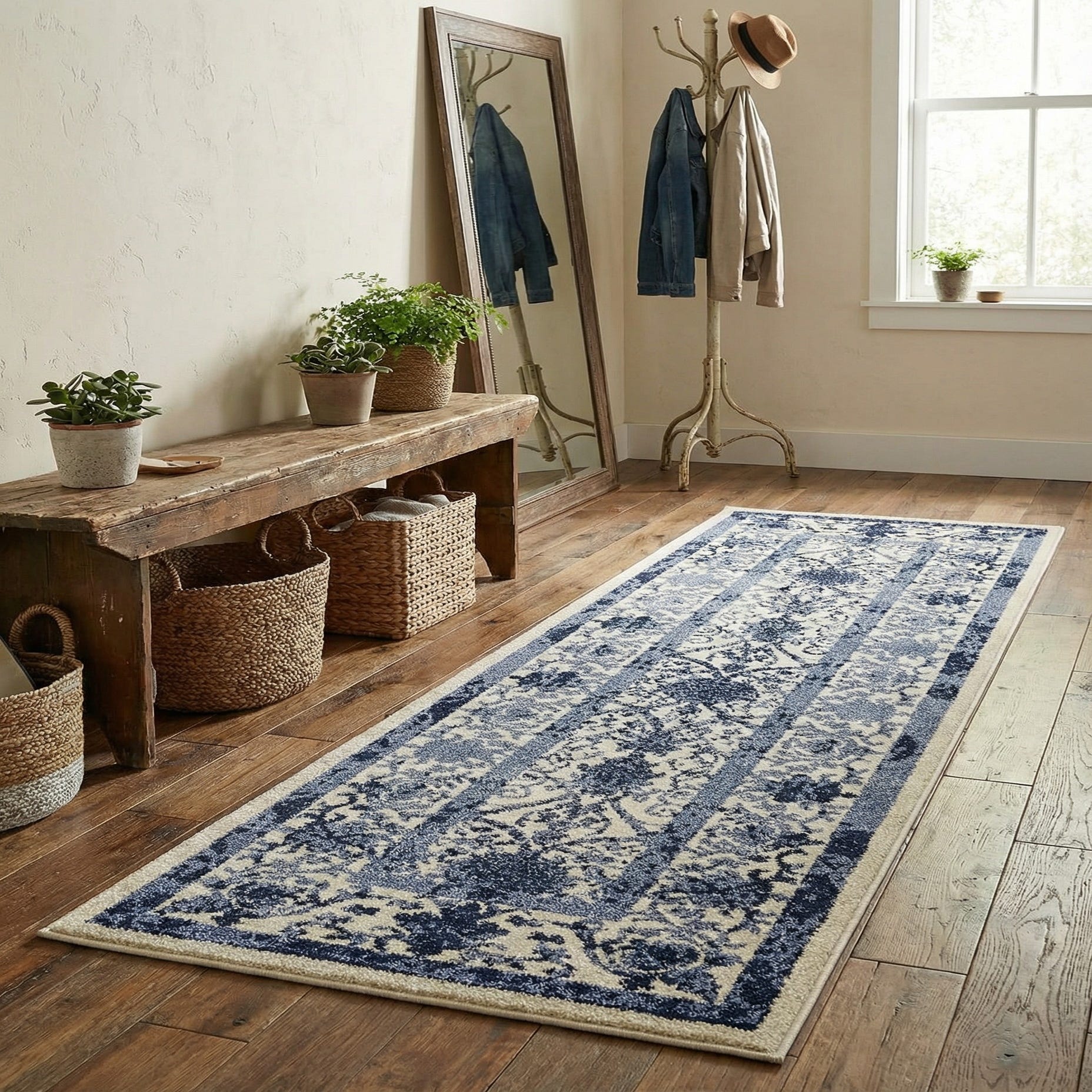 Well-suited for hallways, entryways, or a narrow kitchen passage, this runner brings structured patterning to transitional, coastal, or classic interiors. Pair it with white or light-painted walls and navy accents for a coastal vibe, warm wood furniture and brass details for a traditional setting, or cool grays and streamlined furnishings to add pattern to a contemporary space.