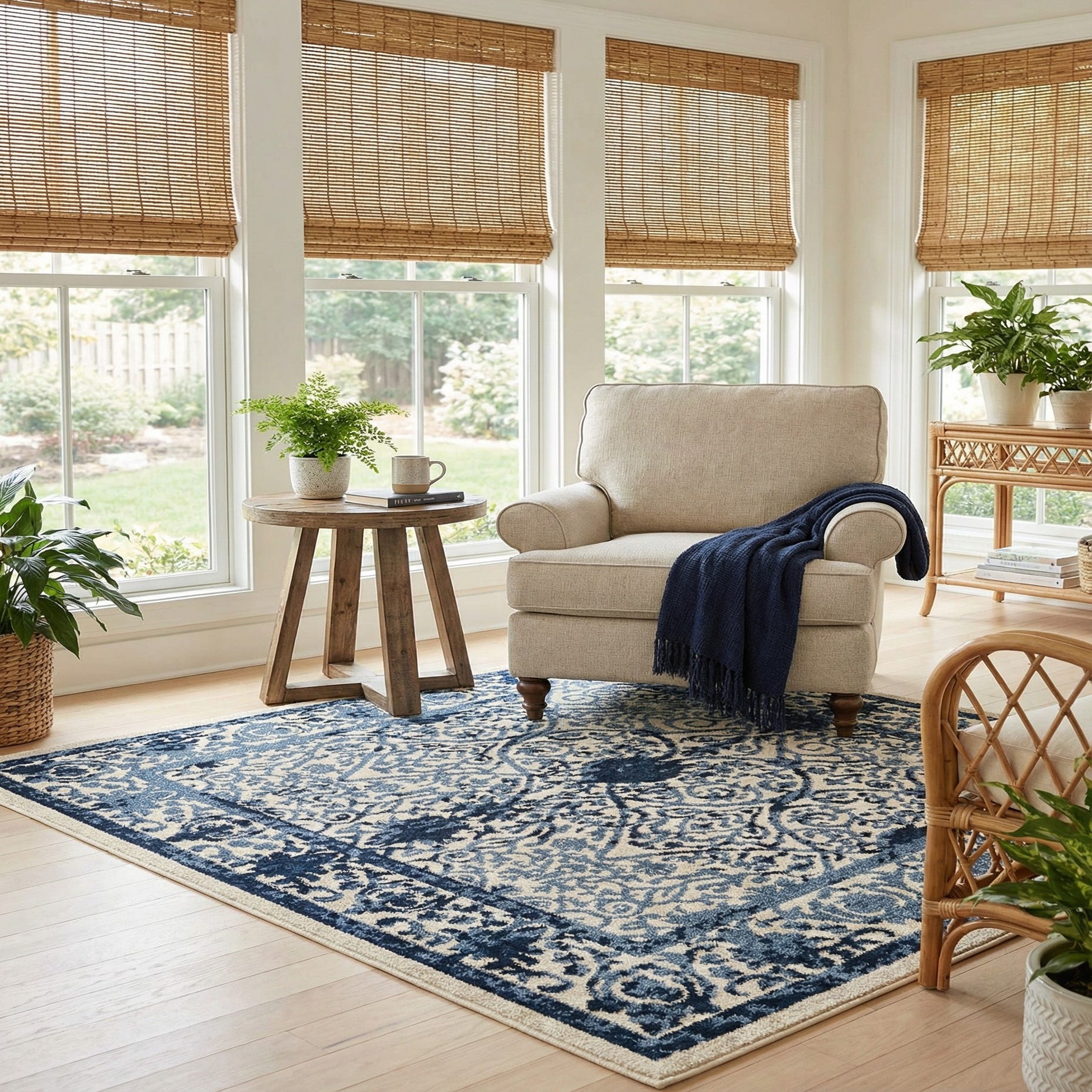 The Miranda Collection offers a timeless centerpiece with its machine-woven 6 Ft Square rug, crafted from 100% polypropylene. Durable and designed for longevity, this rug exhibits a harmonious ivory and blue background, complemented by a multi-tiered pattern of intricate scrolls and botanical motifs. Its color palette includes varying shades of blue, light blue, and navy, ensuring a seamless integration with diverse interior themes.