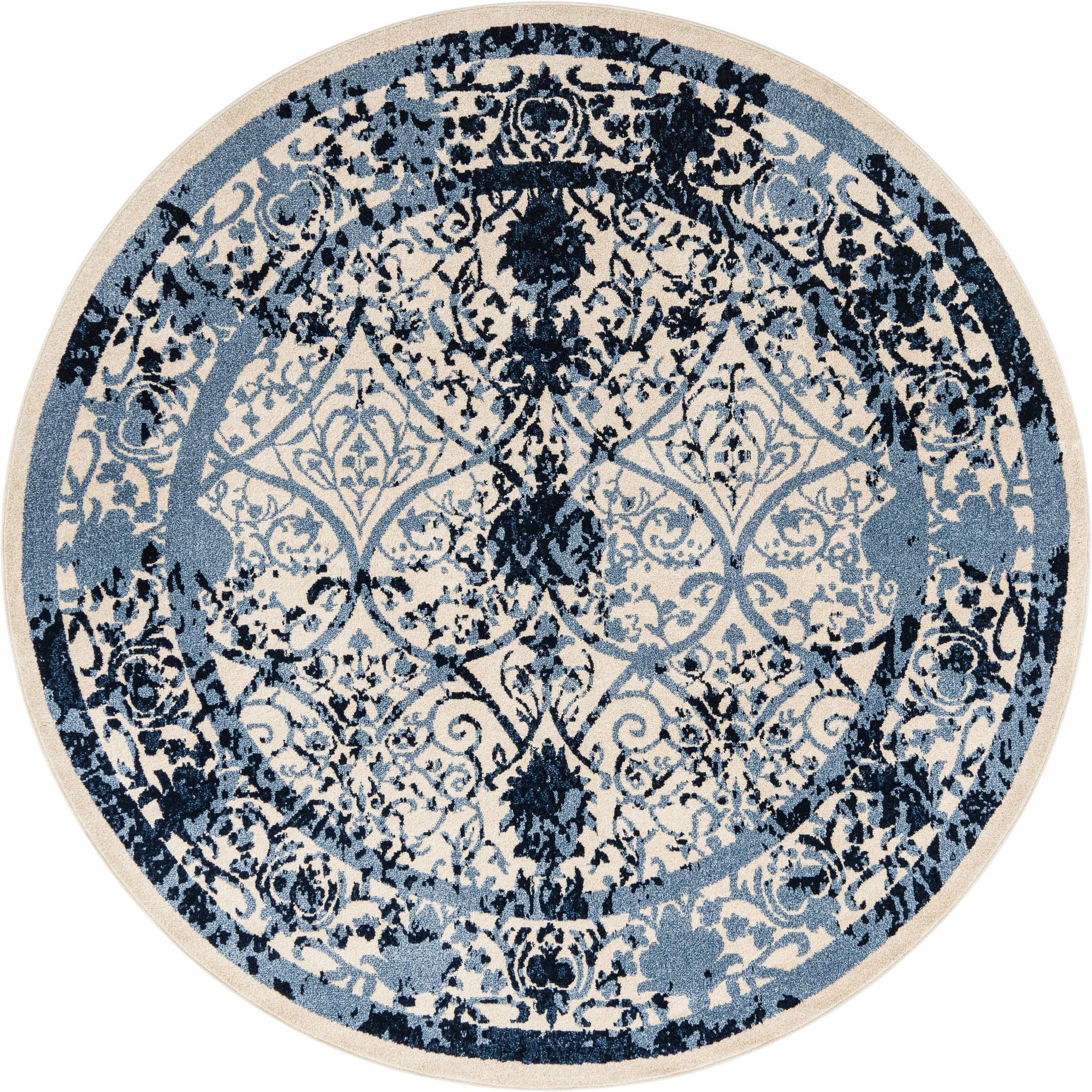 The Miranda Collection offers a sophisticated addition to any space with its machine woven, 100% polypropylene 8 ft round rug. This piece features an elegant blend of colors, including ivory and blue as the primary background, complemented by shades of blue, light blue, and navy blue detailing. Embracing a traditional pattern, the design showcases intricate florals and filigree elements, bringing both visual interest and classic charm to the floor.