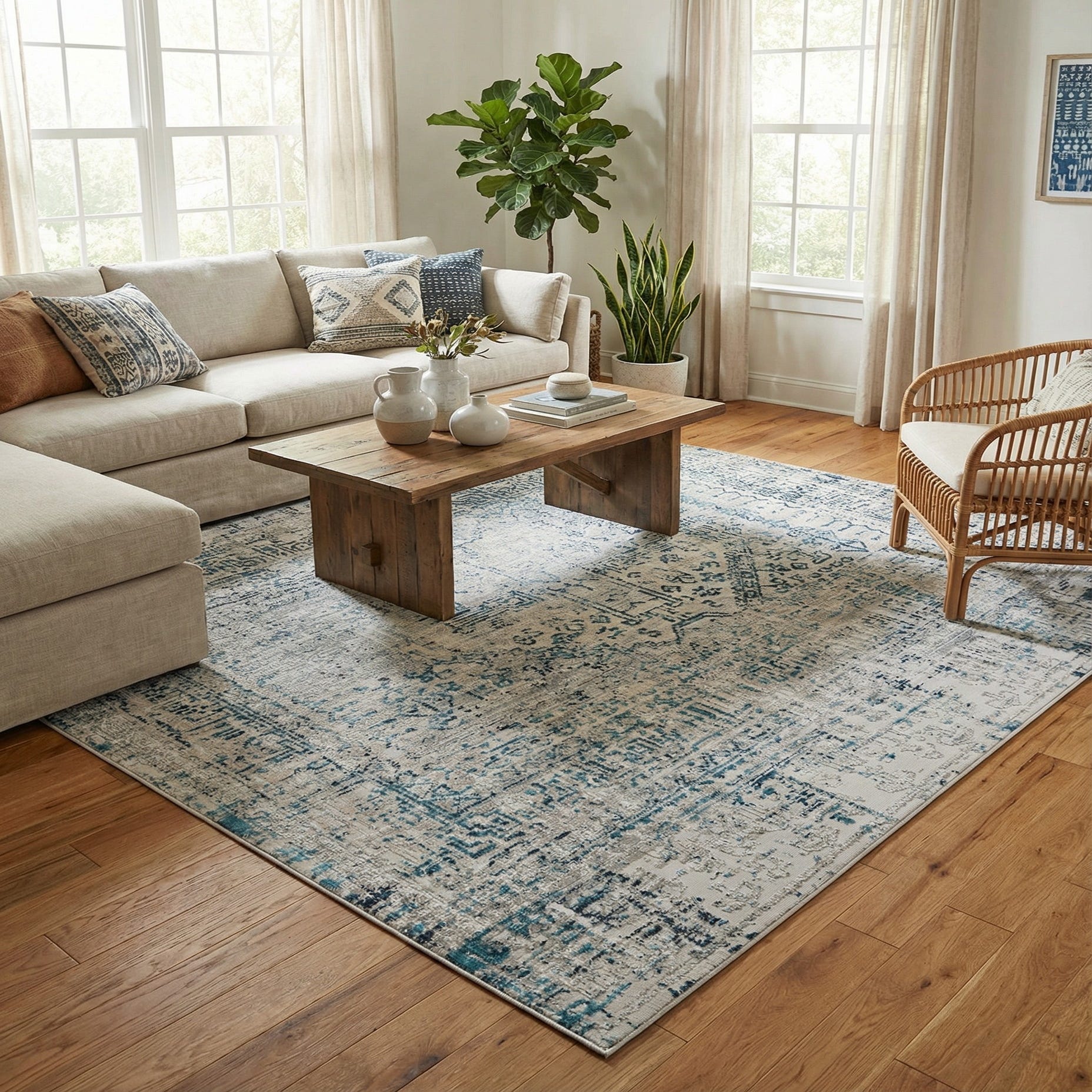 Primary color is Ivory and Blue. Colors in this rug include: Ivory and Blue, Gray.