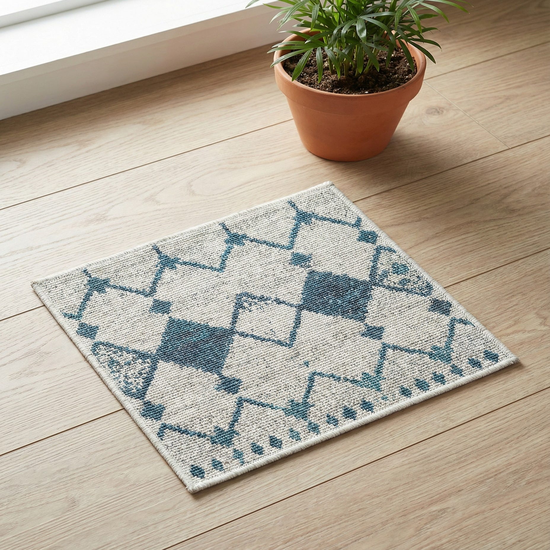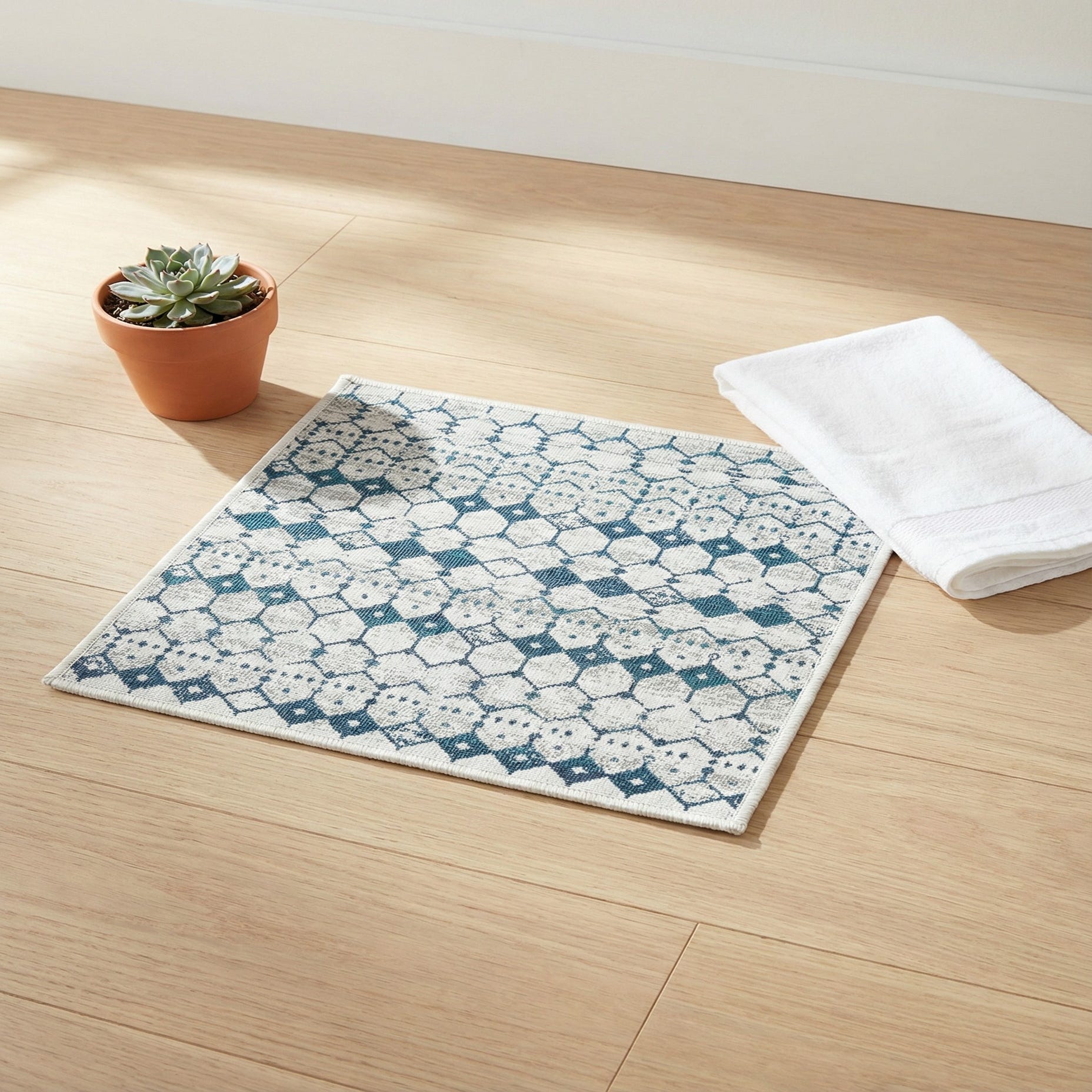 The rug’s cool palette and geometric yet relaxed pattern work well on a covered patio, sunroom or balcony, and will also bring a fresh, casual look to a living room, entryway or dining area. Pair it with whitewashed or natural wood furniture, navy or teal accents and woven textures for a coastal or modern farmhouse feel, or set it beneath clean-lined sofas and metal planters for a contemporary, transitional space.