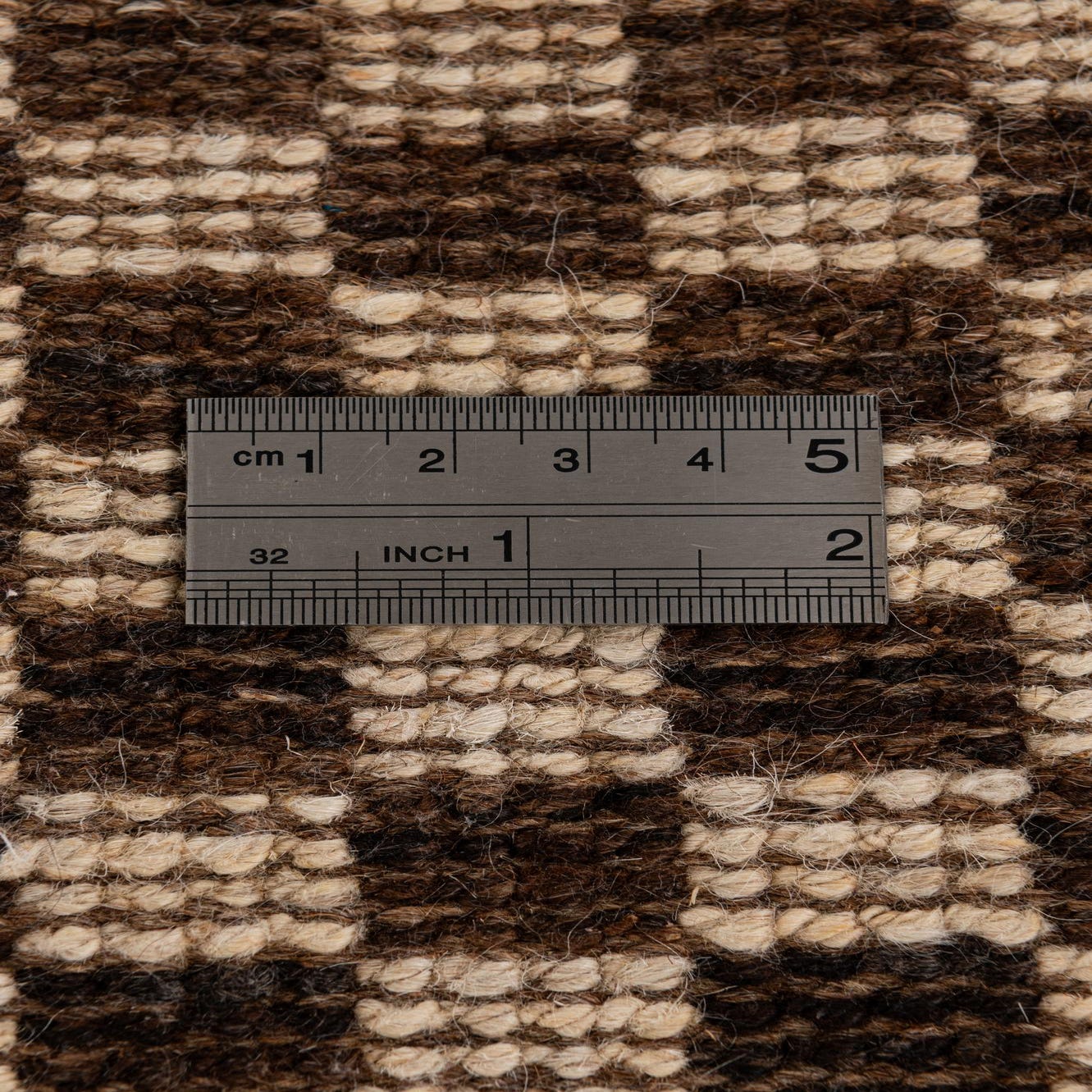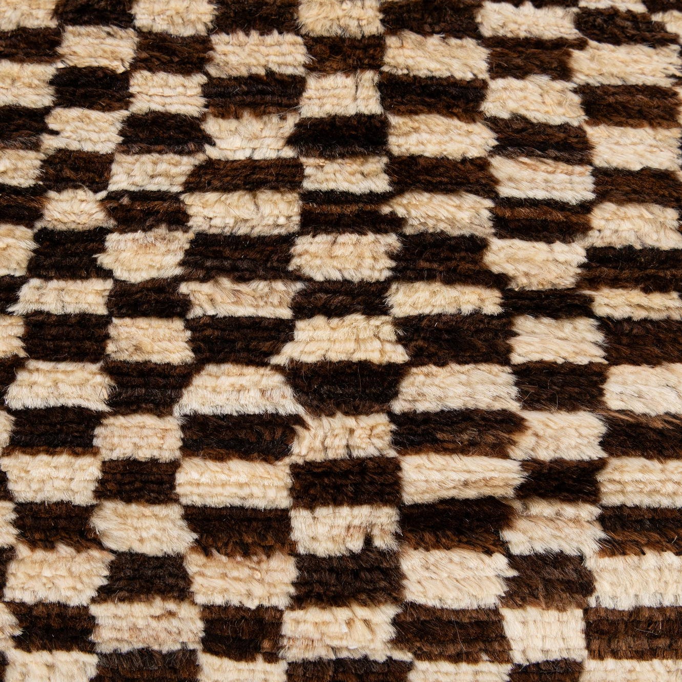 A 5x8 rectangular Moroccan rug with an ivory and brown checkerboard pattern and a solid brown border.