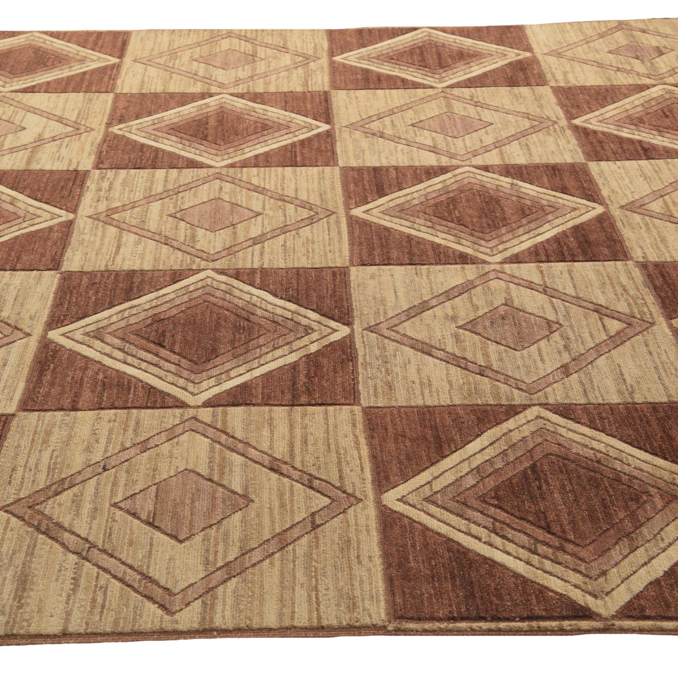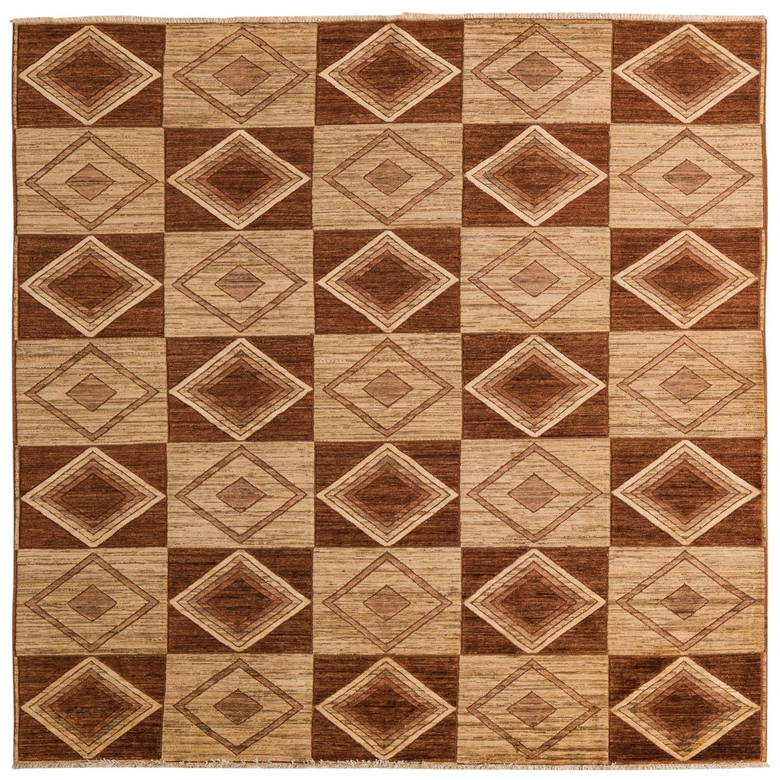 A 9x11 rectangular Modern Ziegler rug featuring an alternating pattern of ivory and brown squares, each containing concentric diamond shapes, made of 100% wool.