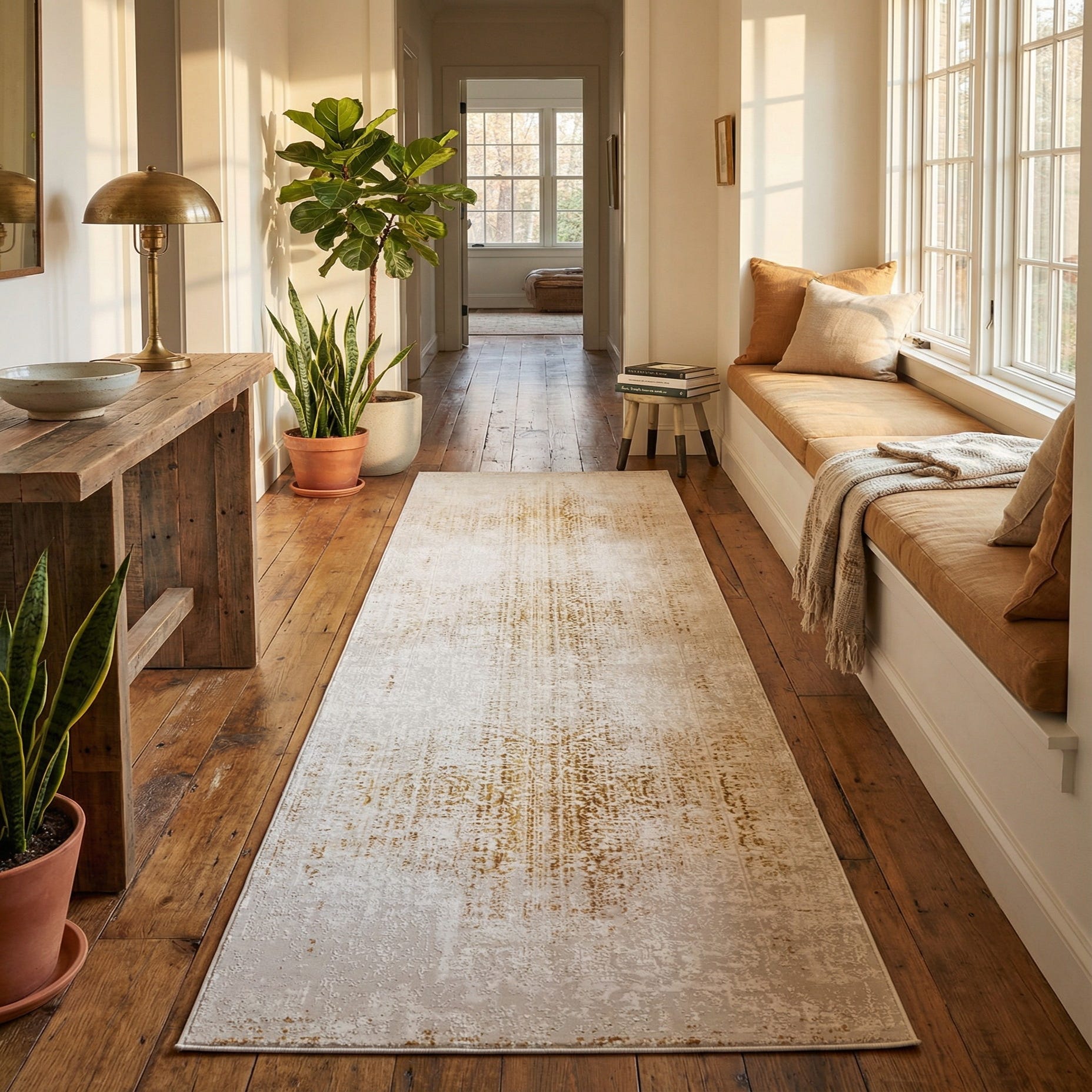 This runner works well in narrow or transitional spaces where a muted but warm anchor is needed — think hallways, entryways, or alongside a bed. It complements natural wood tones, linen or neutral upholstery, and metal finishes like matte brass or aged nickel, and pairs easily with modern, Scandinavian, or softly traditional interiors. Use it to add quiet texture and a hint of golden warmth to a neutral palette or to balance richer wood and leather furnishings.