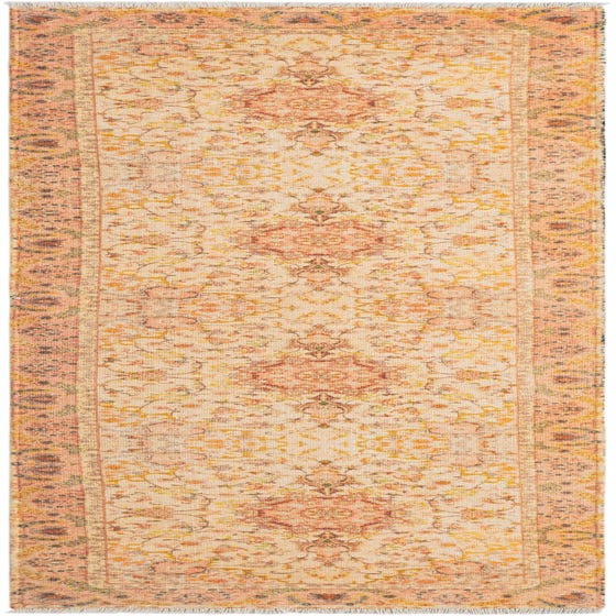 Primary color is Ivory and Gold. Colors in this rug include: Ivory and Gold, Black, Brown, Green, Orange, Peach, Yellow.