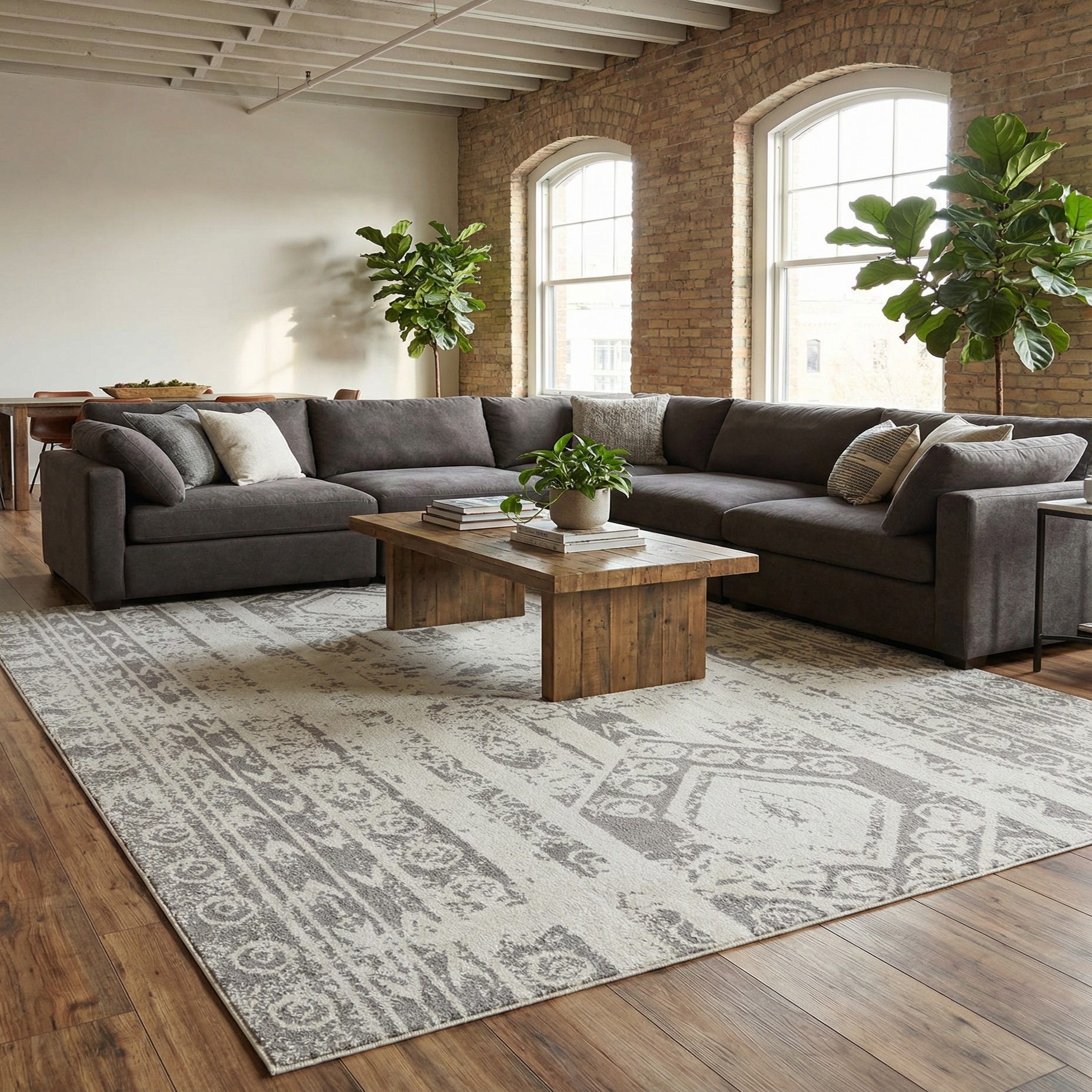 This neutral palette and timeless pattern work well in a range of interiors — place it under a light-upholstered sofa in a contemporary living room, beneath a natural wood dining table for a modern farmhouse feel, or layered at the foot of a bed in a calm, Scandinavian-inspired bedroom. Pair with soft linens, pale woods, and pewter or brushed-nickel accents to enhance the ivory and gray tones and keep the room feeling bright and cohesive.