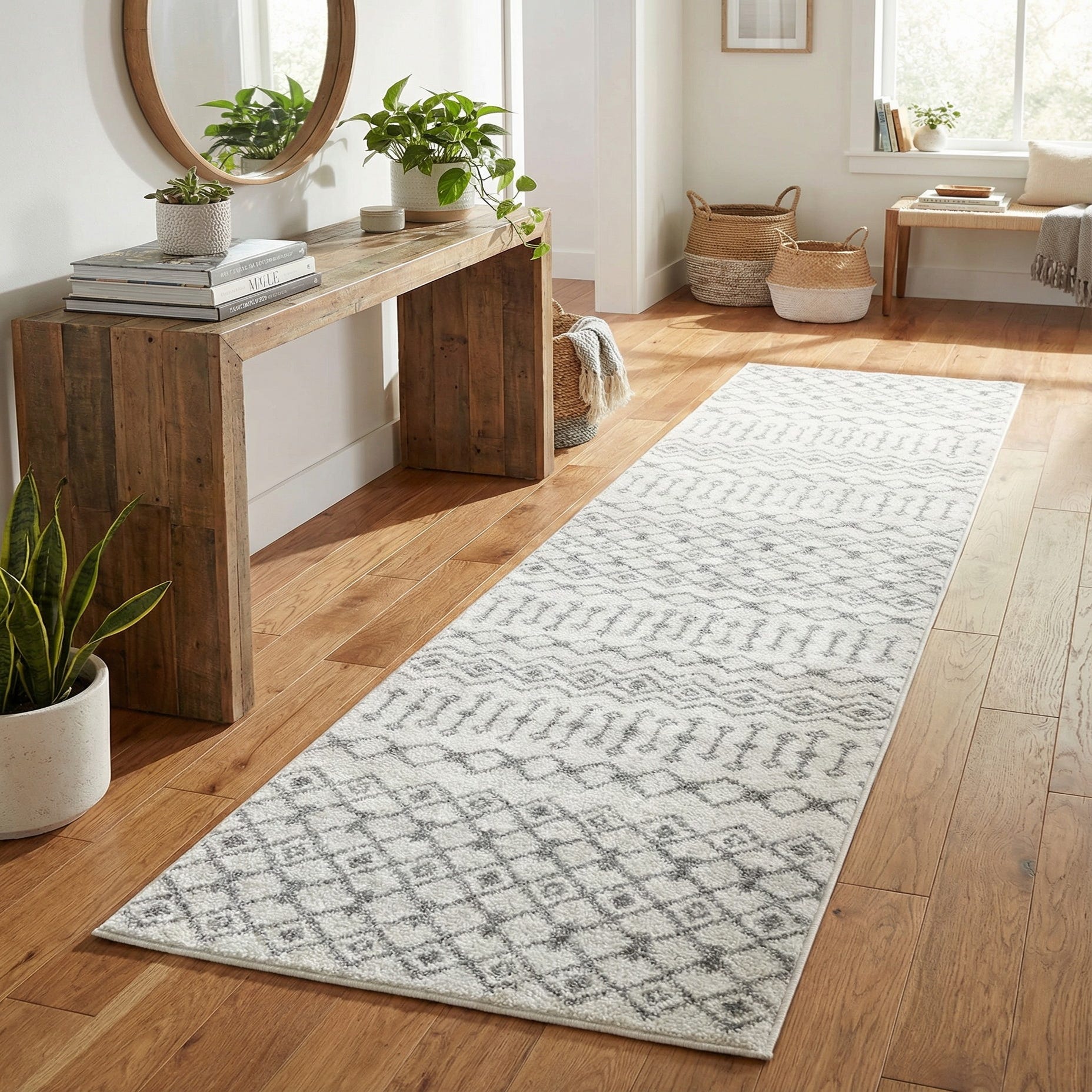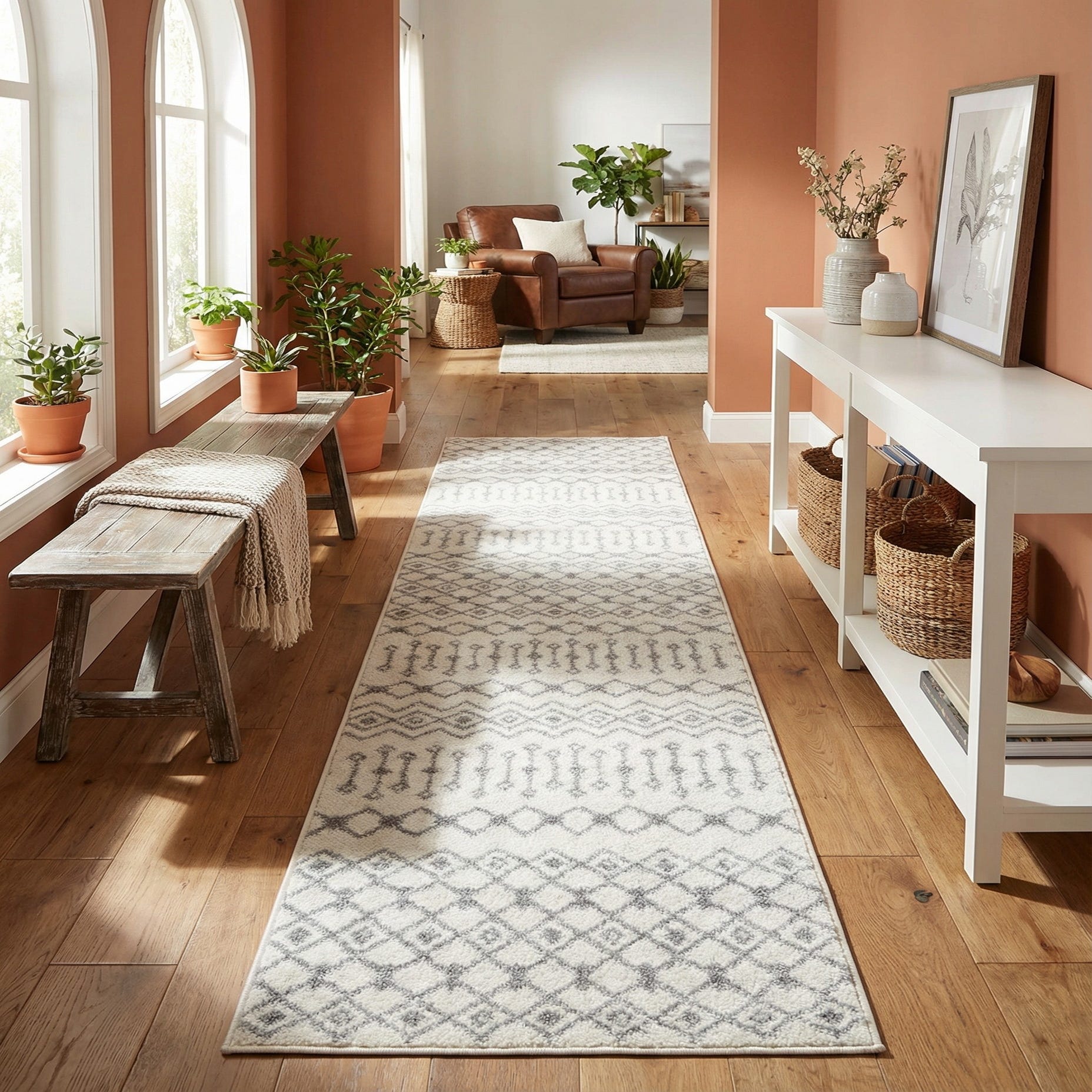 A 12 ft runner rug featuring a cream background with gray bohemian trellis and diamond patterns, ideal for a hallway.