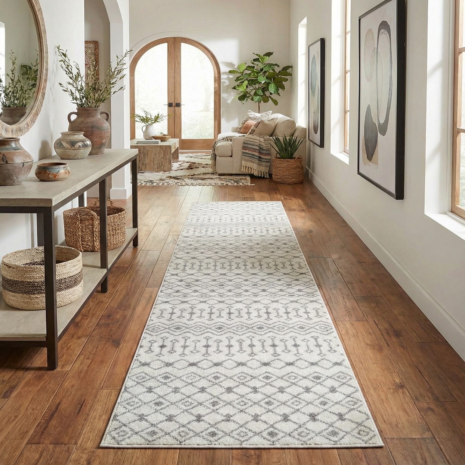 This runner works well in a narrow entryway or hall where you want pattern and brightness without heavy contrast. Pair it with natural wood floors and neutral upholstery for a modern farmhouse or Scandinavian scheme, or use it in a transitional kitchen galley to bring softness underfoot and visual interest between cabinetry. It also layers nicely over larger area rugs in living spaces to add texture and pattern without competing with existing color palettes.