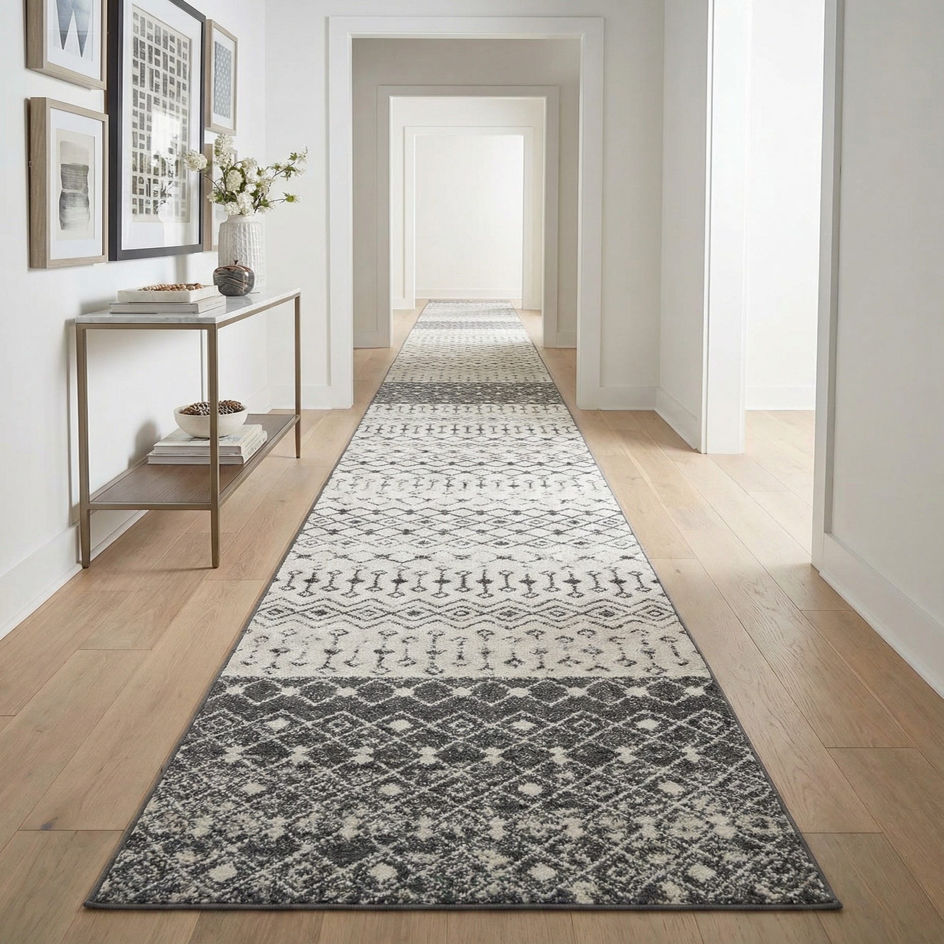 Designed for long, narrow spaces, this runner works well in hallways, entryways, and alongside kitchen islands. It pairs naturally with neutral palettes and warm wood floors, and complements modern farmhouse, Scandinavian, or transitional interiors that favor understated pattern and tonal contrast. Use it to anchor a long corridor, define a gallery-style space, or add quiet graphic interest to a layered living area.