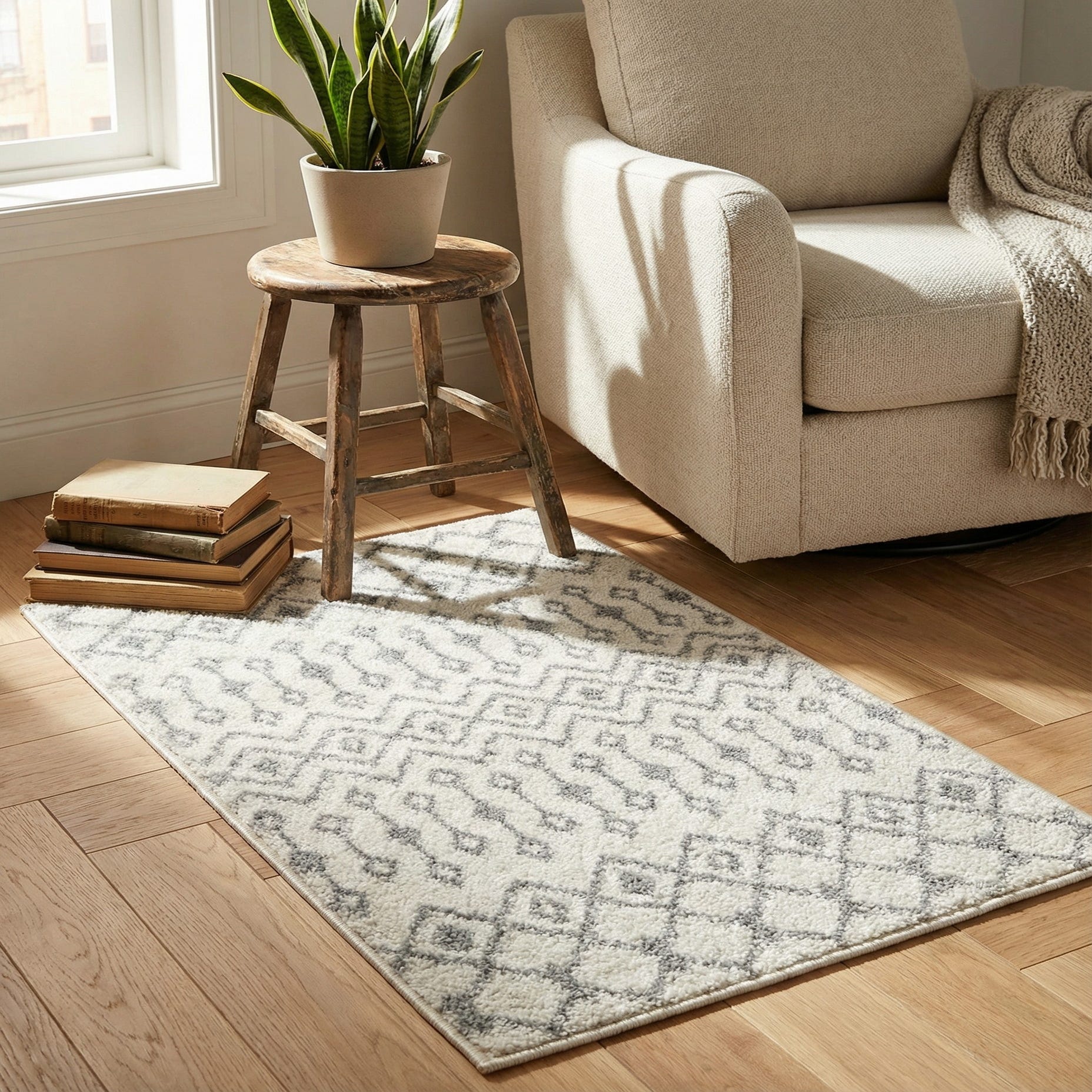 Machine-made in polypropylene, the rug feels dense and springy underfoot without being heavy. Its neutral palette and understated geometric pattern make it easy to layer into a variety of interiors — place it in an entryway or powder room to warm hard floors, tuck it beside a bed for a soft landing first thing in the morning, or layer it over a larger rug in a living room for added texture. It pairs especially well with light woods, soft linens, and simple, modern furnishings or with more relaxed, bohemian pieces where pattern and texture are layered.