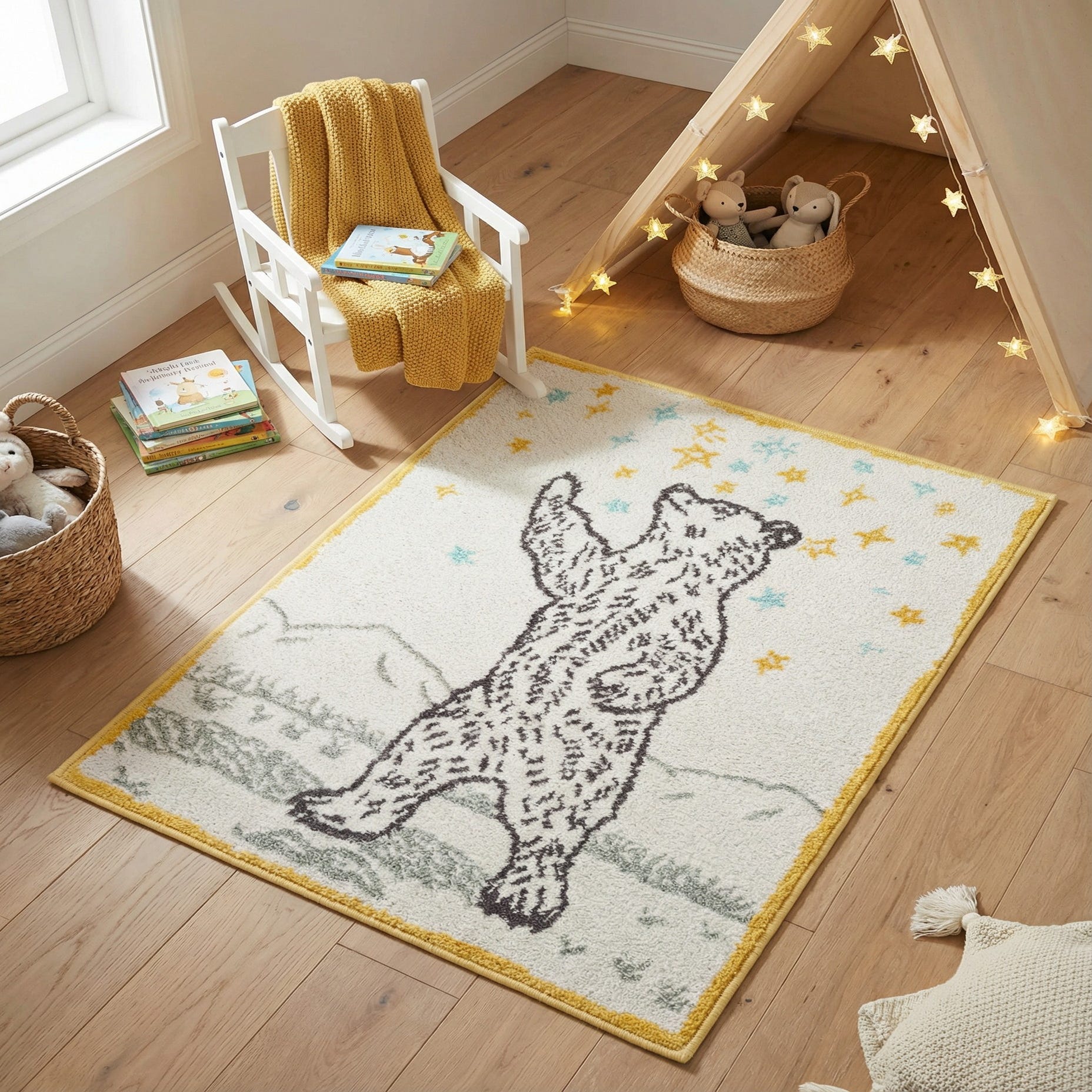 Made from 100% polypropylene, the surface has a plush, pleasantly cushioned feel that invites little ones to sit and play. The hand-drawn illustration and muted background suit a range of nursery and kid spaces — pair it with pale wood furniture and pastel textiles for a Scandinavian-inspired nursery, layer it in a cozy reading nook with floor cushions and a small bookshelf, or use it in a casual playroom alongside durable, easygoing furnishings. The neutral base with pops of light blue and yellow also works well in contemporary or cottage-style interiors that want a touch of whimsy without overwhelming the room.