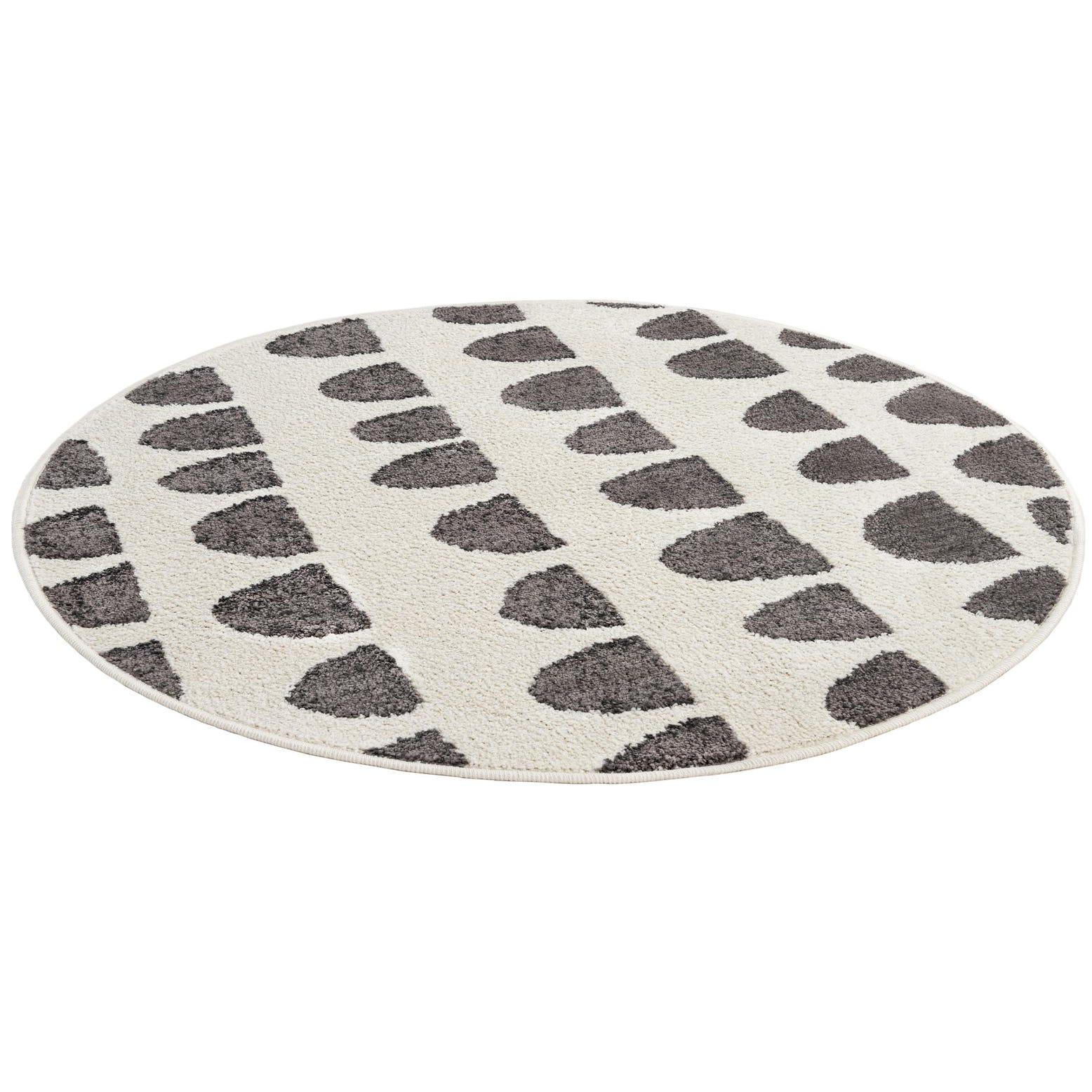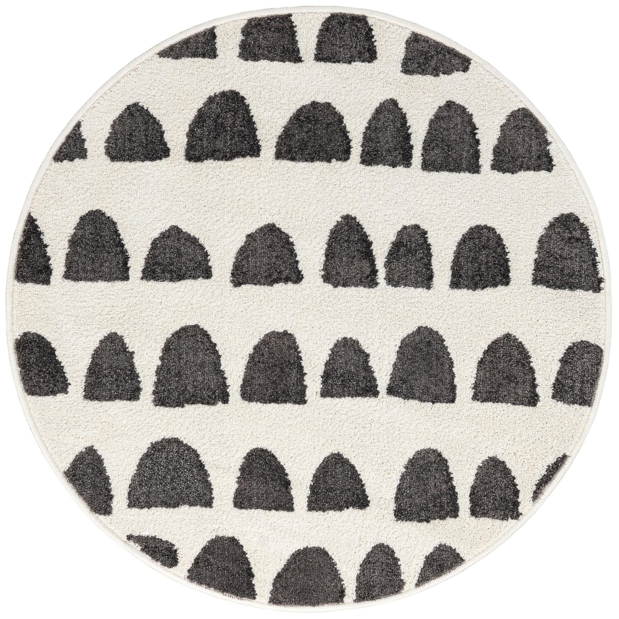 A 3' 3 round ivory rug with a modern pattern of charcoal gray half-circle shapes arranged in rows.