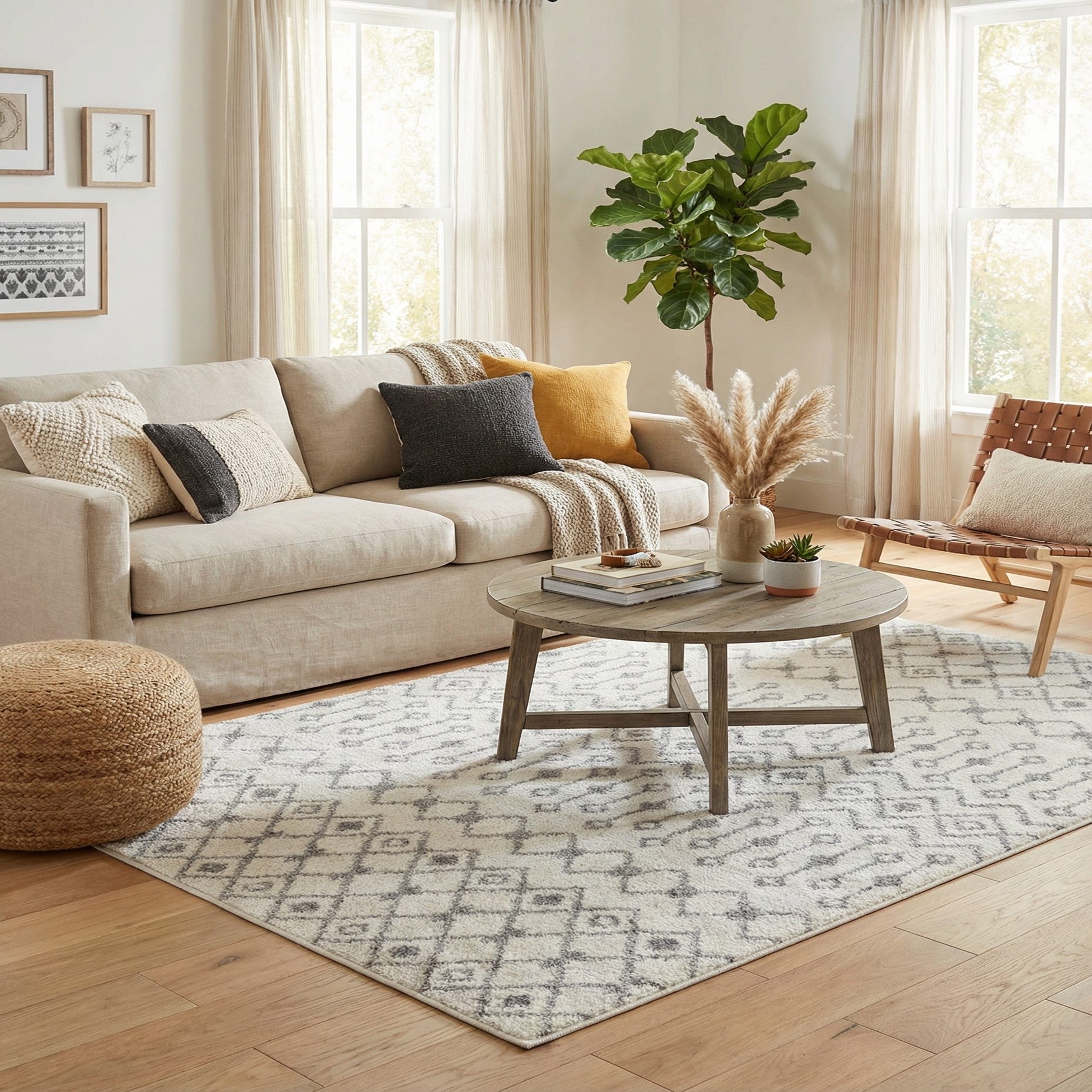 This neutral ivory-and-gray rug fits easily into contemporary, transitional, Scandinavian, or modern farmhouse schemes. Use it to anchor a living room seating area, soften a bedroom floor, or add calm texture to a home office or entryway. It pairs well with natural wood tones, linen upholstery, and cool metal accents for a cohesive, relaxed palette.
