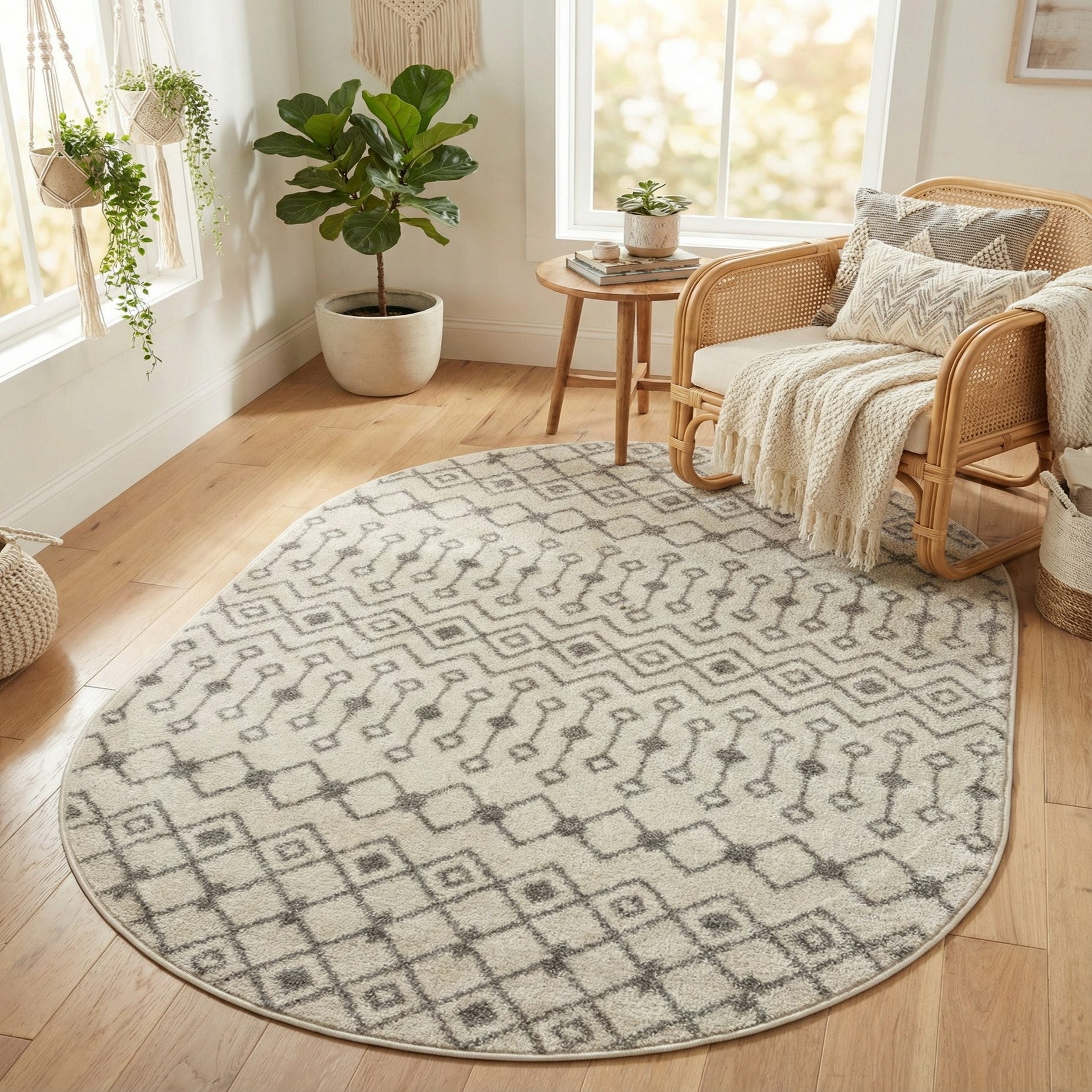 An oval ivory and gray Moroccan Trellis rug with a bohemian tribal pattern, featuring diamond and dashed line motifs.