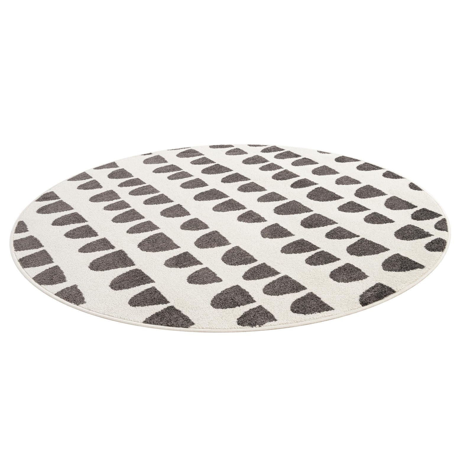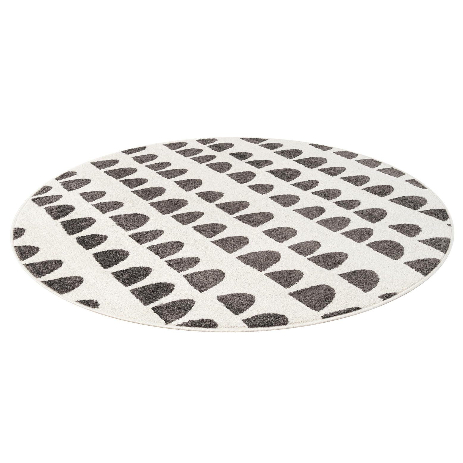A 5' round ivory rug with a modern abstract pattern of charcoal gray half-circle shapes arranged in rows.