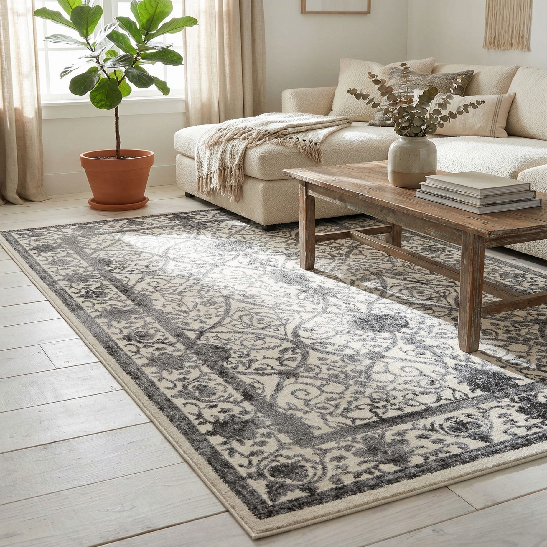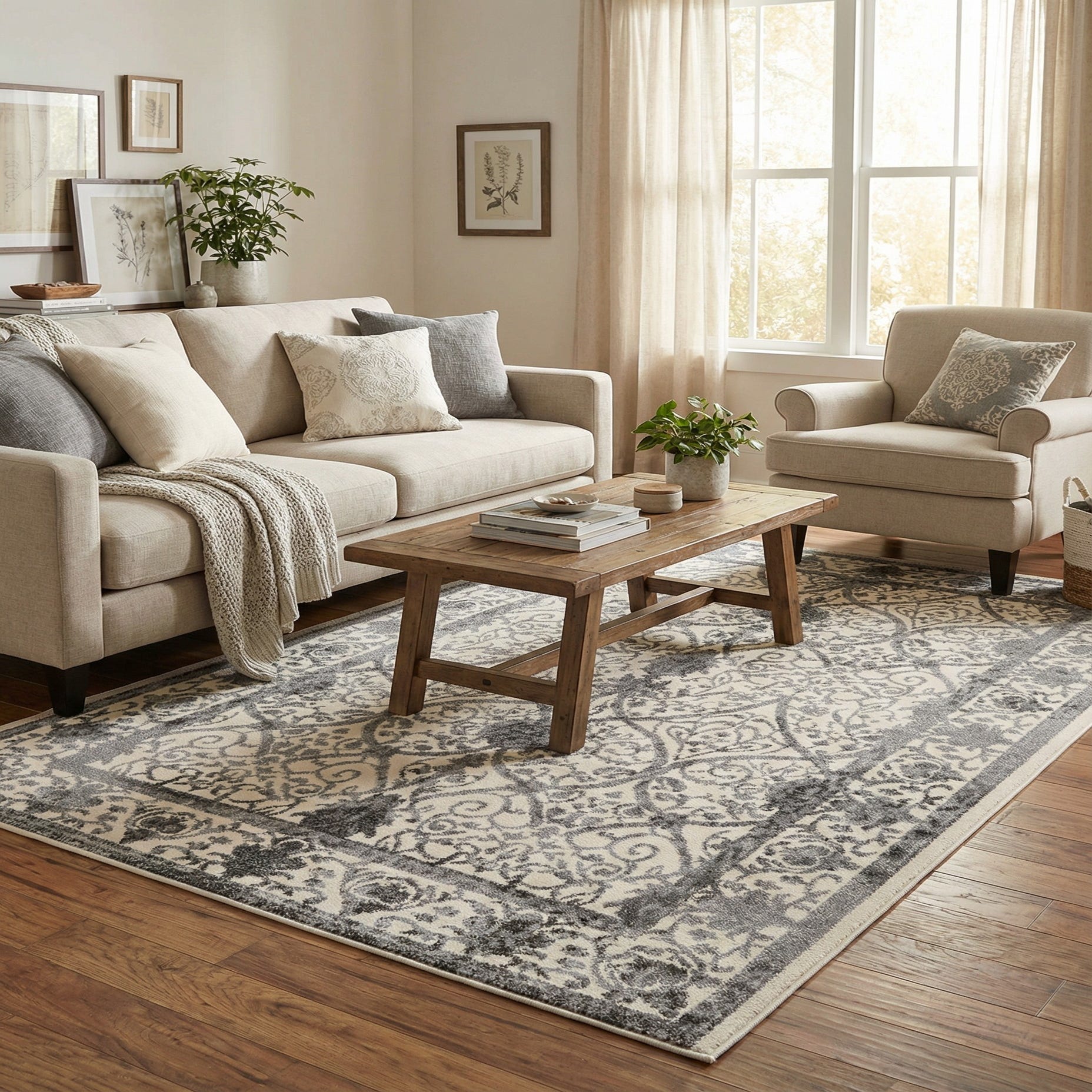 This neutral, patterned rug works well as an anchor for a living room seating area, under a smaller dining table, or layered at the foot of a bed. It pairs easily with warm wood furniture, metal accents, and neutral upholstery—suiting transitional, traditional, or modern farmhouse interiors where subtle pattern and versatile color are desired.