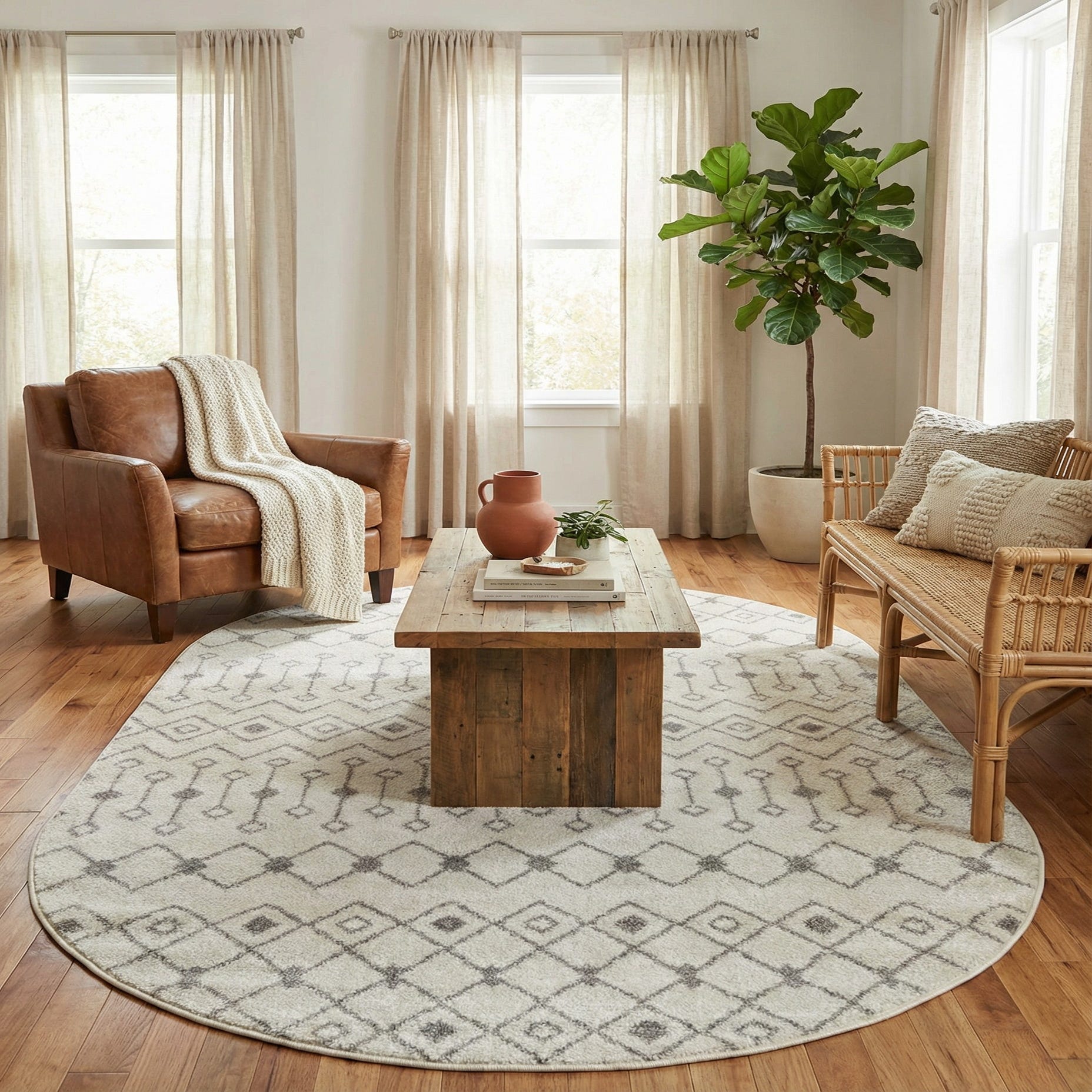 This oval shape and neutral motif work well as an entryway or foyer anchor, beneath a round dining table, or layered under a coffee table to soften a living area. It pairs naturally with Scandinavian and transitional interiors, light wood floors, painted cabinetry, and metal or rattan accents for a relaxed, balanced look.