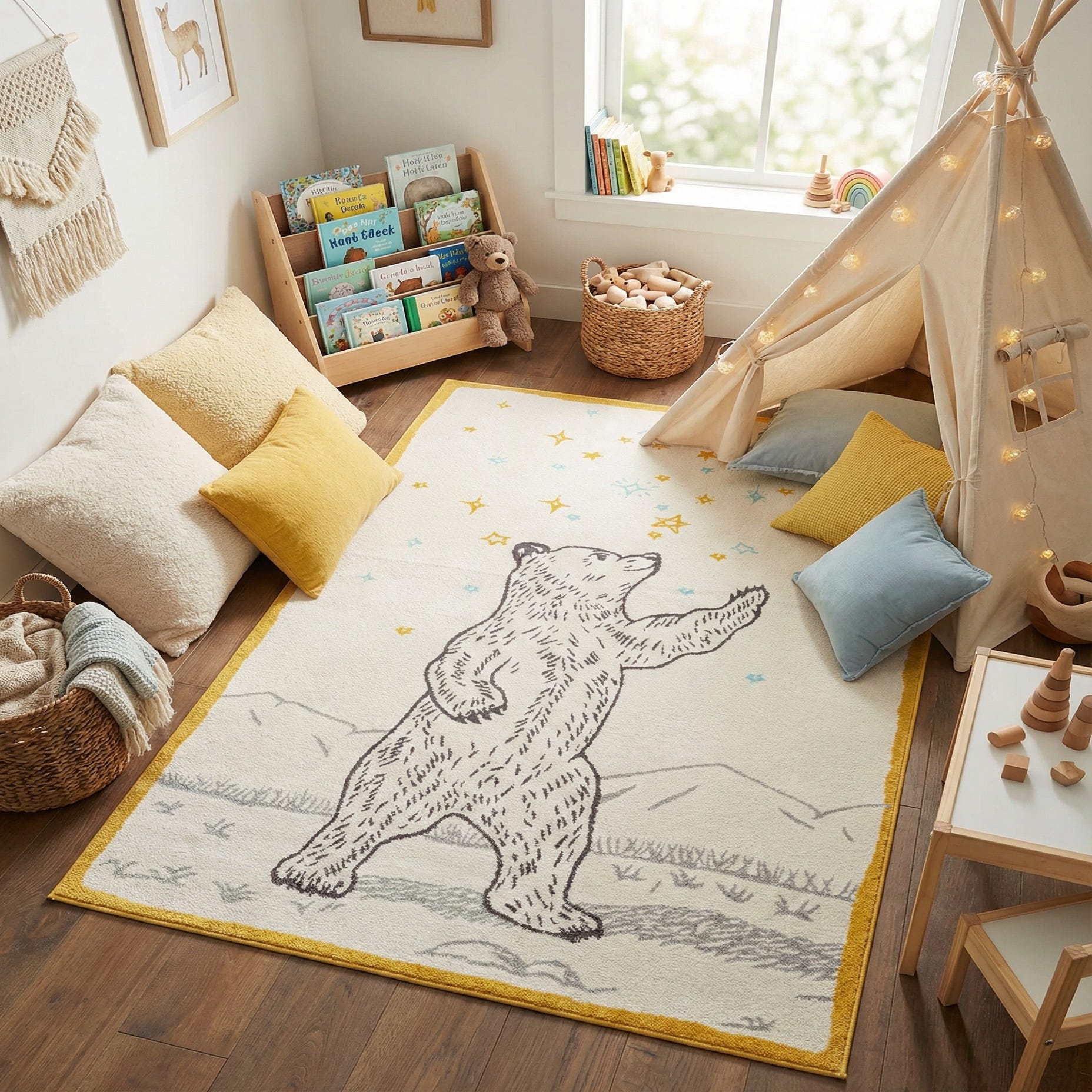 This 5x8 Whimsy Kids rug presents a playful and charming design suitable for children's spaces and nurseries. Its stain-resistant and shed-free 100% polypropylene composition ensures durability and ease of maintenance. Featuring an ivory and gray background, the rug showcases a delightful navy blue sketch of a bear, complemented by scattered yellow stars that add a pop of color and whimsy to the design. The rug's outline is highlighted with a bright yellow border, which frames the piece and adds a cheerful touch.