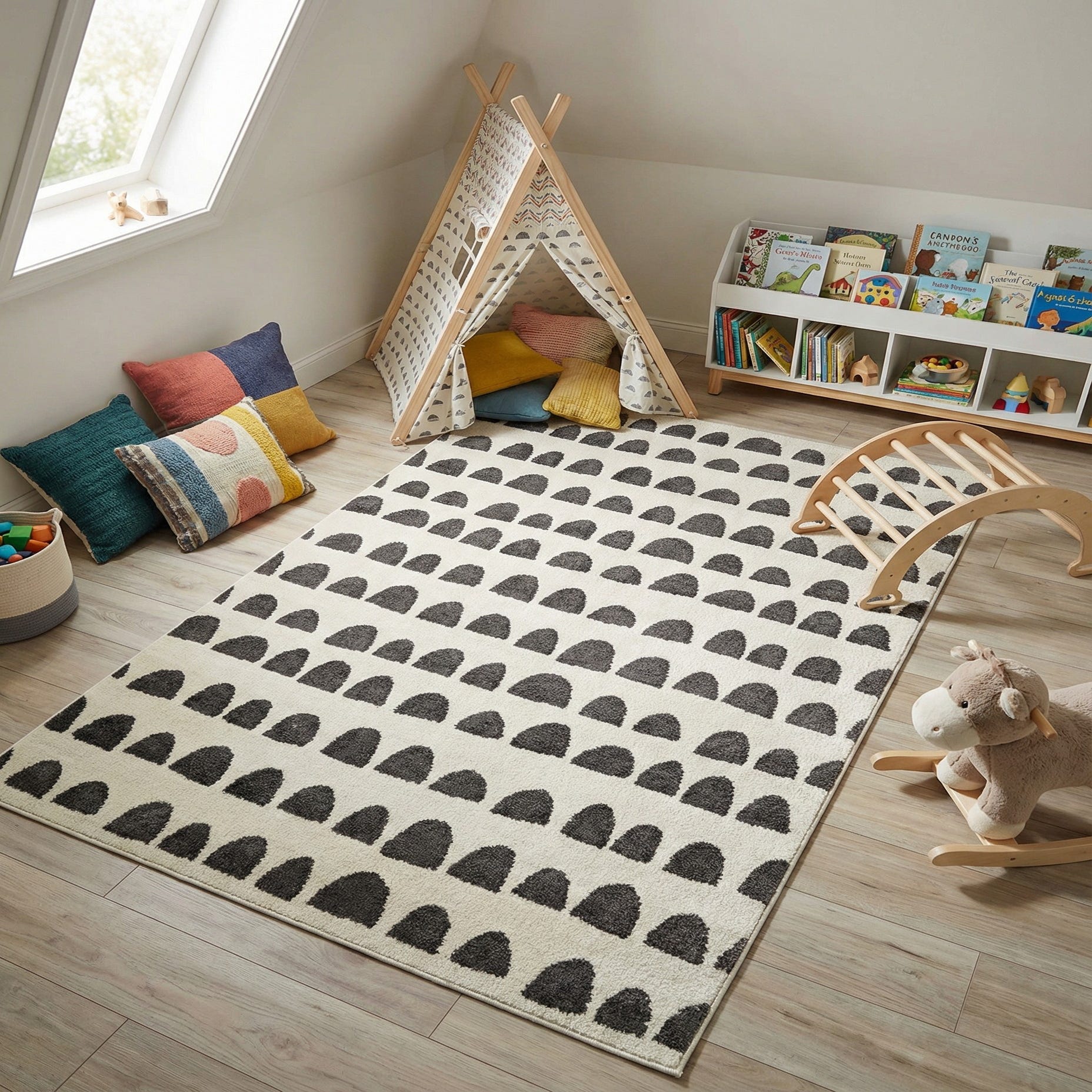 This neutral, graphic piece works well in a nursery or kids’ room, anchoring a reading nook or play area while leaving room for colorful toys and textiles. It also pairs cleanly with Scandinavian or modern minimalist interiors — try it beneath a low-profile sofa, layered over hardwood, or placed in an entry or casual living space to introduce pattern without overwhelming the room. Light wood, white furniture, and woven accents complement the ivory and gray palette for a calm, coordinated look.