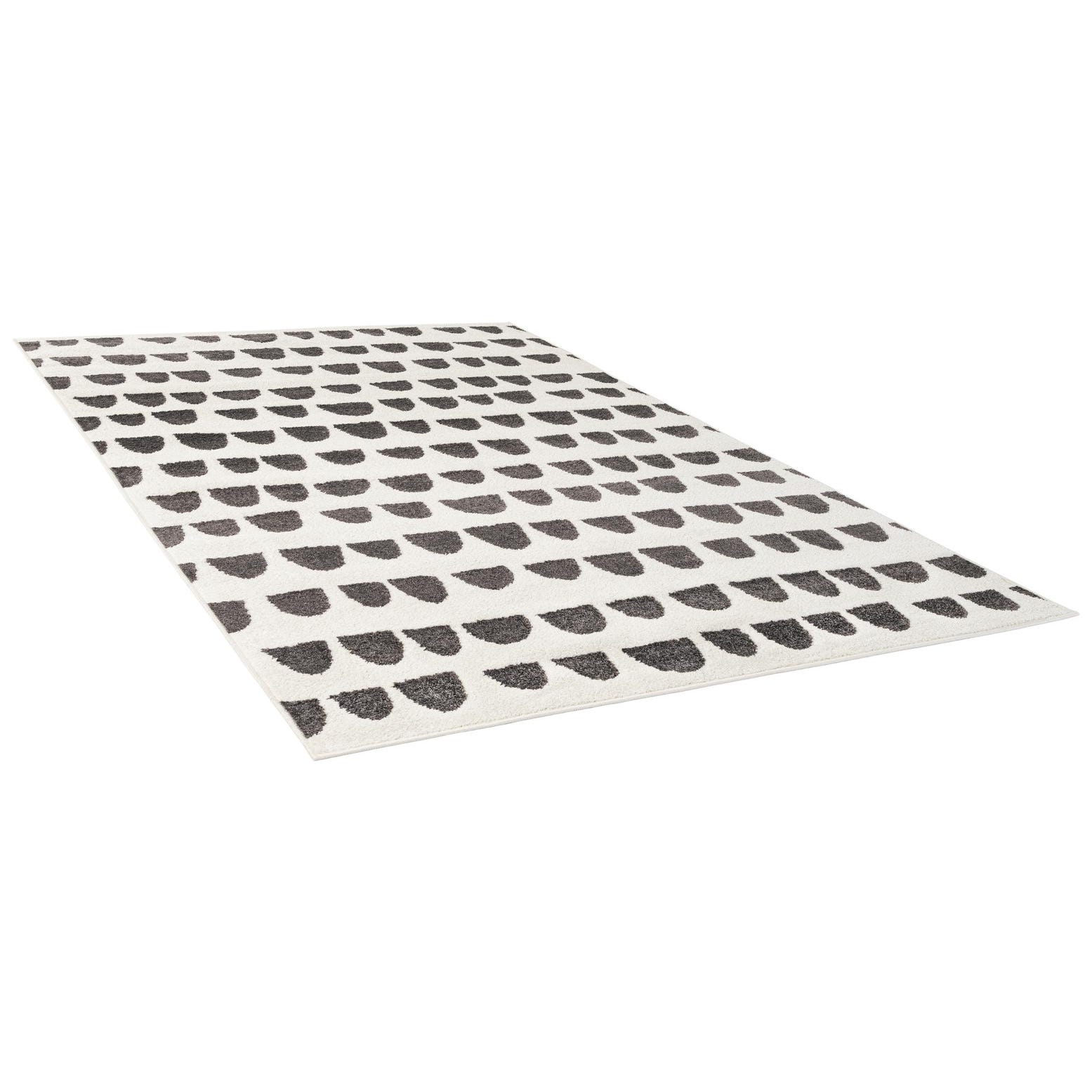 An ivory ground sets a calm stage for rows of hand-drawn semicircles in charcoal gray, arranged in evenly spaced bands that create a playful, rhythmic pattern. The shapes have slightly irregular edges that give the design a handmade, modern look. Machine made from 100% polypropylene, the rug has a soft cut pile base with the gray motifs worked at a slightly higher level, creating a gentle low-relief texture that feels plush underfoot and adds visual depth.