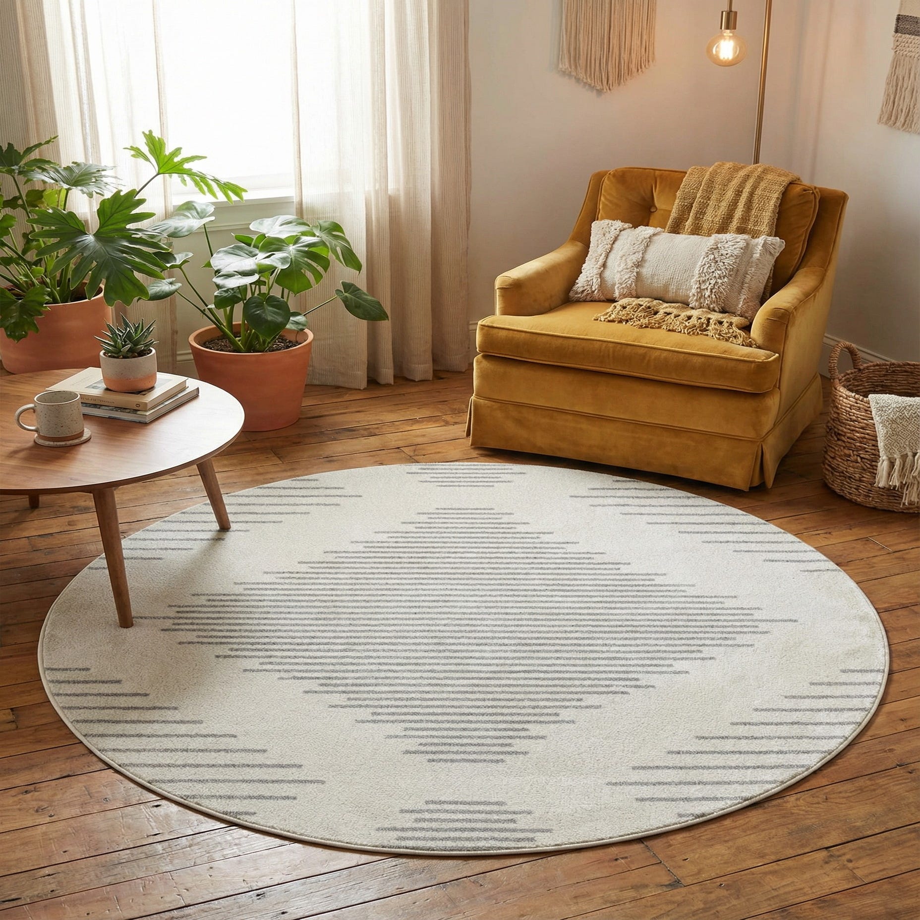 A round rug with a calm, modern presence, this piece uses a centered diamond motif built from thin, evenly spaced gray lines on an ivory field. The horizontal bar pattern repeats at the edges, giving the rug a balanced, rhythmic look that reads as both graphic and understated. The low, dense pile made from 100% polypropylene has a smooth, slightly cushioned hand that layers neatly beneath furniture and feels comfortable underfoot.