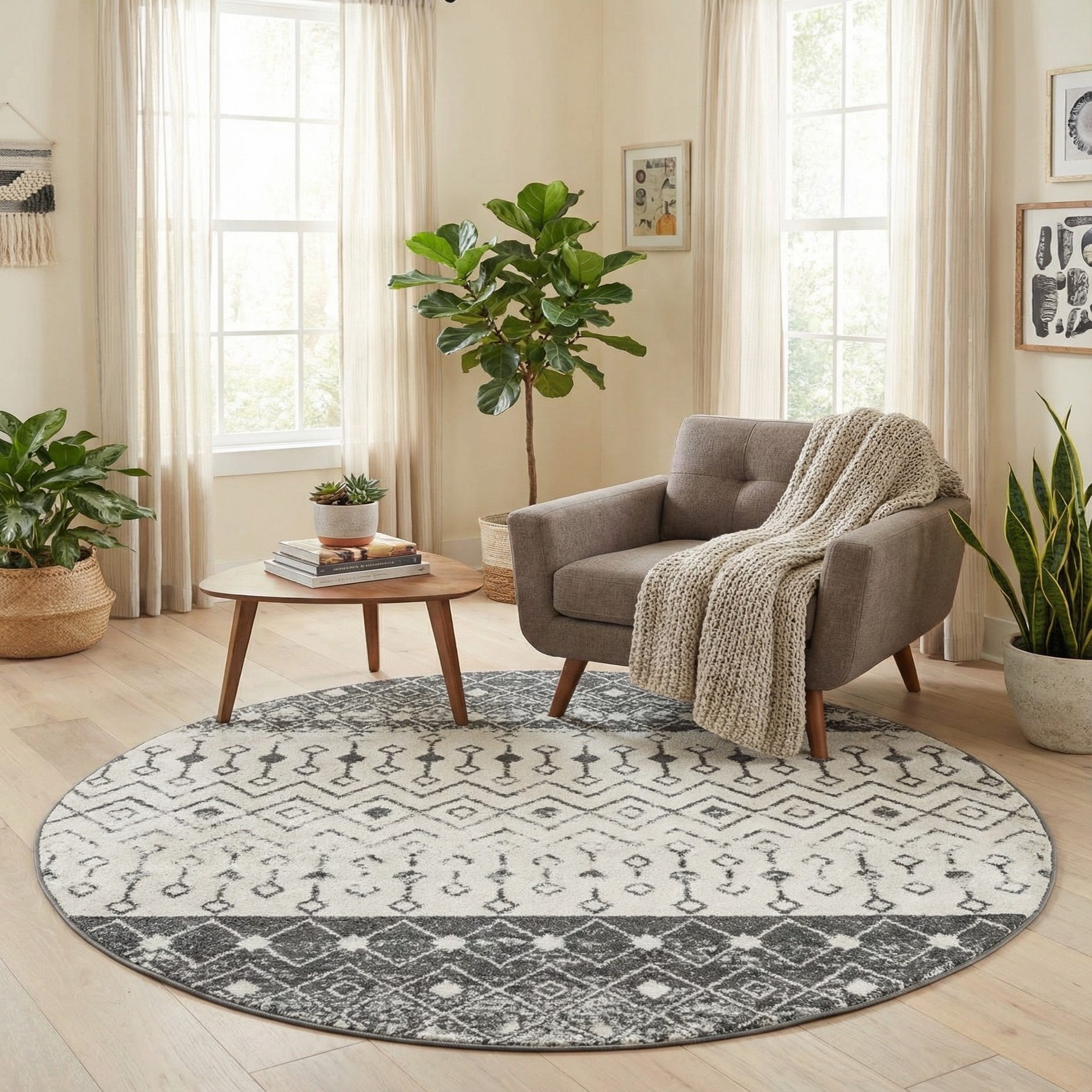 A 6' round ivory and gray Bohemian rug with tribal trellis patterns, ideal for a modern living space.