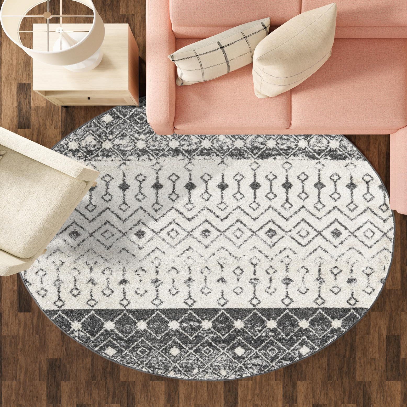 A soft, low-pile polypropylene rug with a neutral ivory and gray palette, this round piece pairs a classic Moroccan trellis motif with linear bands of diamonds and key-like icons. The machine-made construction produces a tight, even surface that feels smooth underfoot, while subtle variations in pile height give the pattern gentle depth and a slightly worn, vintage character. The ivory field brightens a room and the gray motifs provide contrast without overwhelming the space.