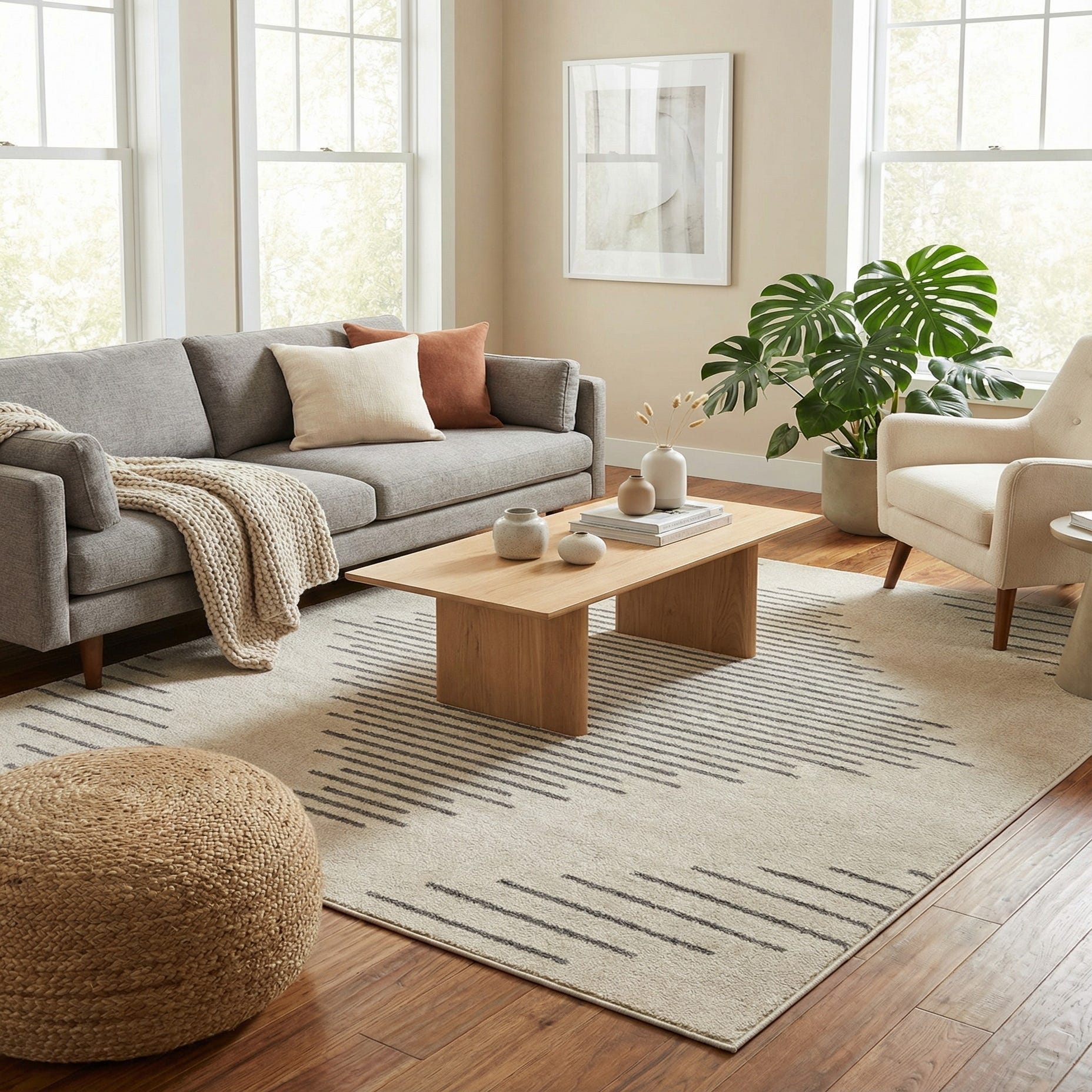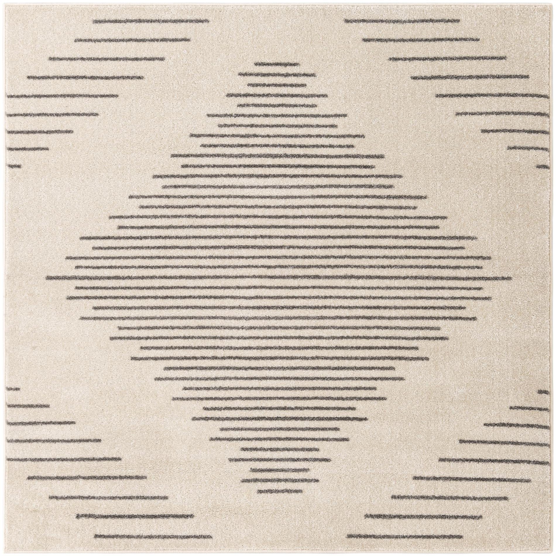 A square ivory and gray area rug featuring a modern geometric pattern of horizontal lines forming a large central diamond.