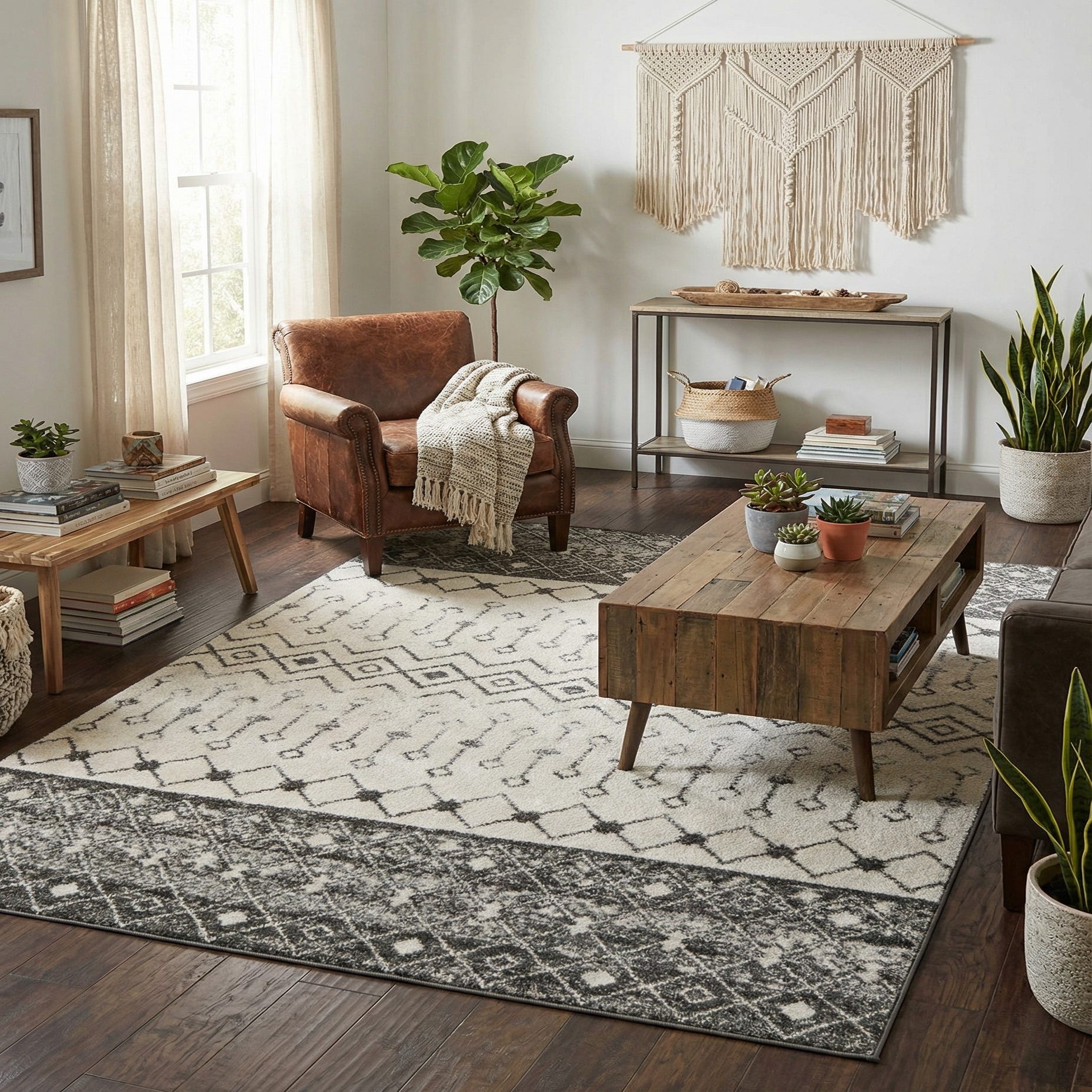 Machine-made of polypropylene, the rug has a low- to medium-pile that feels soft underfoot with a lightly textured surface that holds the pattern definition. It works nicely as an anchor for a neutral living room or under a coffee table, and it pairs well with natural wood furniture, matte black metal accents or linen upholstery. The pattern complements modern farmhouse, transitional, Scandinavian, or casual bohemian interiors and can be layered for added warmth in a bedroom or used to define a seating or dining area.