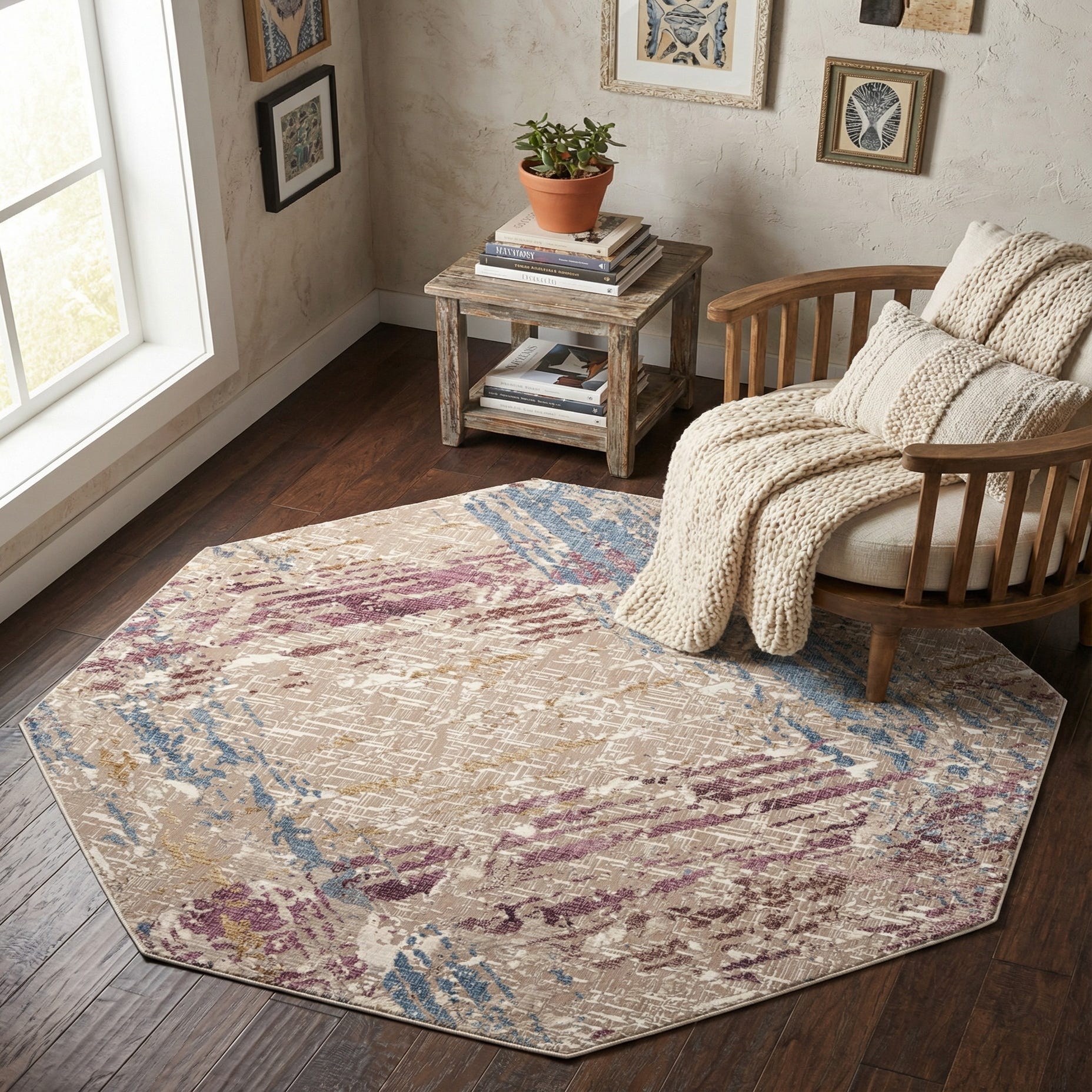 The octagonal silhouette adds architectural character and works well where a standard rectangle would feel predictable — place it beneath a round dining table, anchor a small seating group, or make a foyer feel more inviting. It pairs nicely with neutral upholstery and warm wood tones, and it can bring color into minimalist, transitional, bohemian, or soft-modern interiors. Combine with textured pillows, brass or gold accents, and linen drapery to enhance the rug’s layered look.