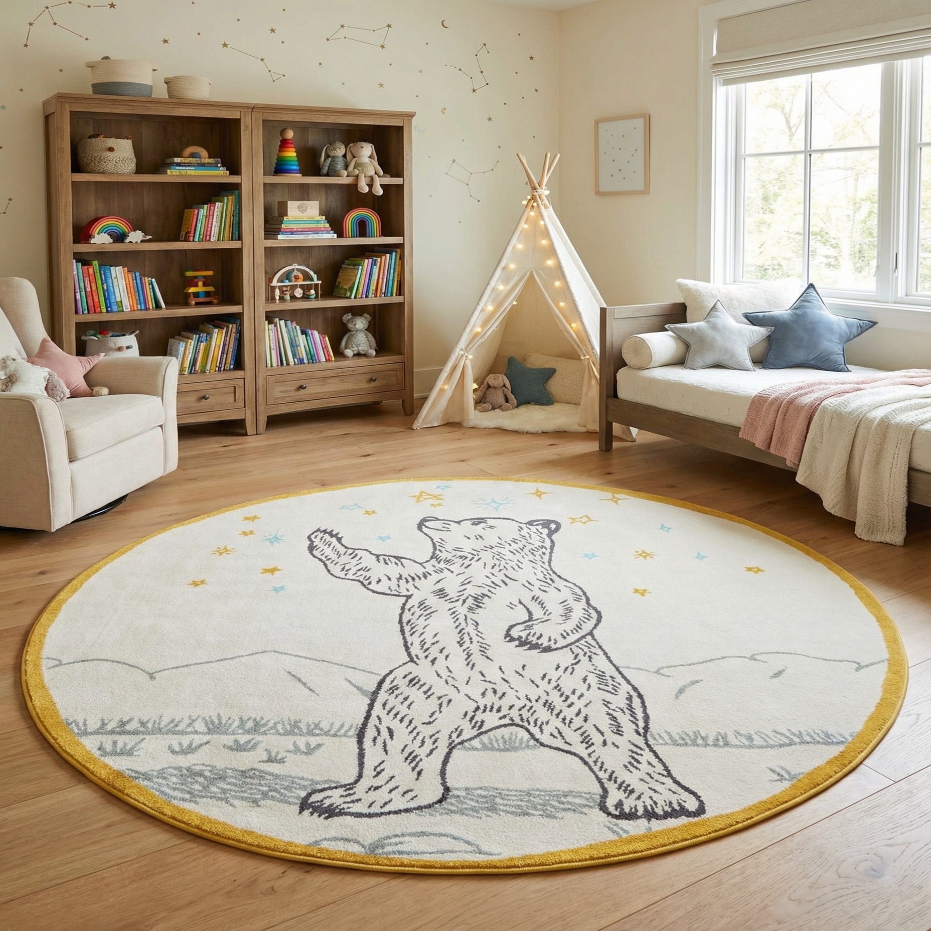 The rug's patterning is set against an inviting ivory and gray background, complemented by accents in black, yellow, and navy blue. The bold outlines of the bear's figure add a graphic statement to the piece, while the surrounding constellation of stars creates a sense of wonder and imagination.