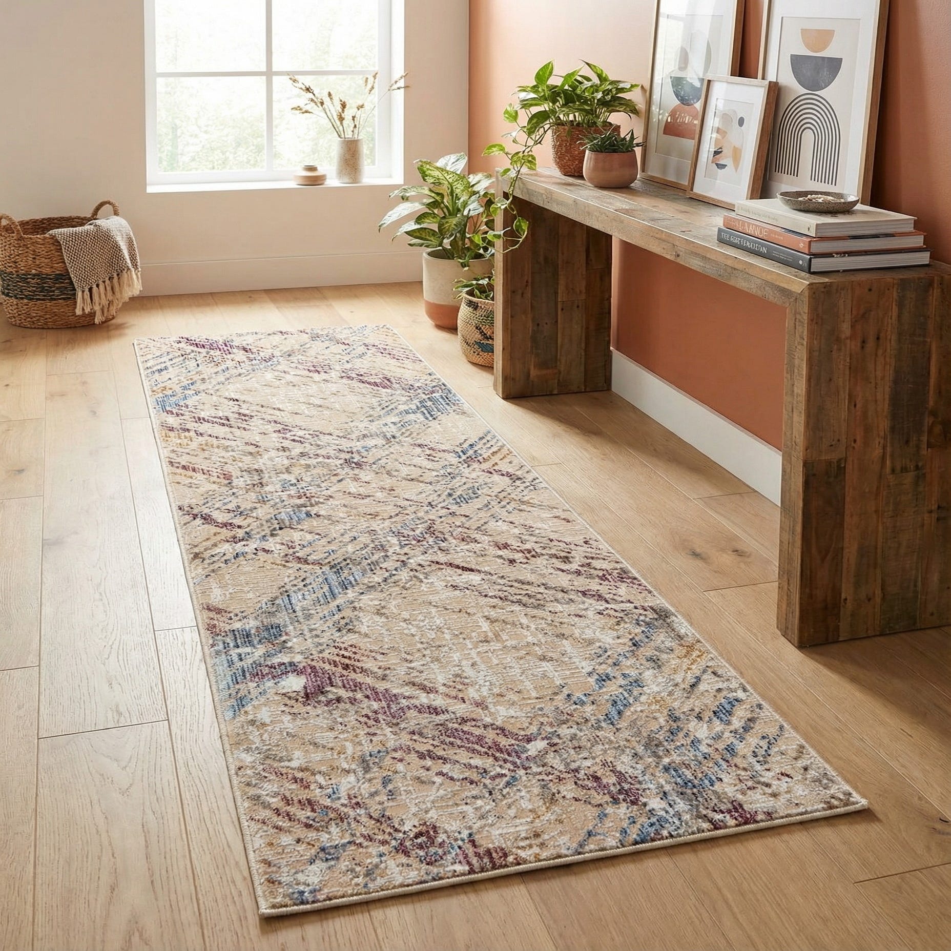 Machine made from 100% polyester, the rug delivers a comfortable, resilient feel suited to daily use. Its calming background and restrained pops of color work well in hallways and entryways, alongside a bed, or as a narrow kitchen runner. Pair it with light or medium wood floors, neutral upholstery and woven accents for a relaxed, contemporary feel, or add navy and jewel-toned pillows to bring out the blue and purple highlights in eclectic or transitional schemes.