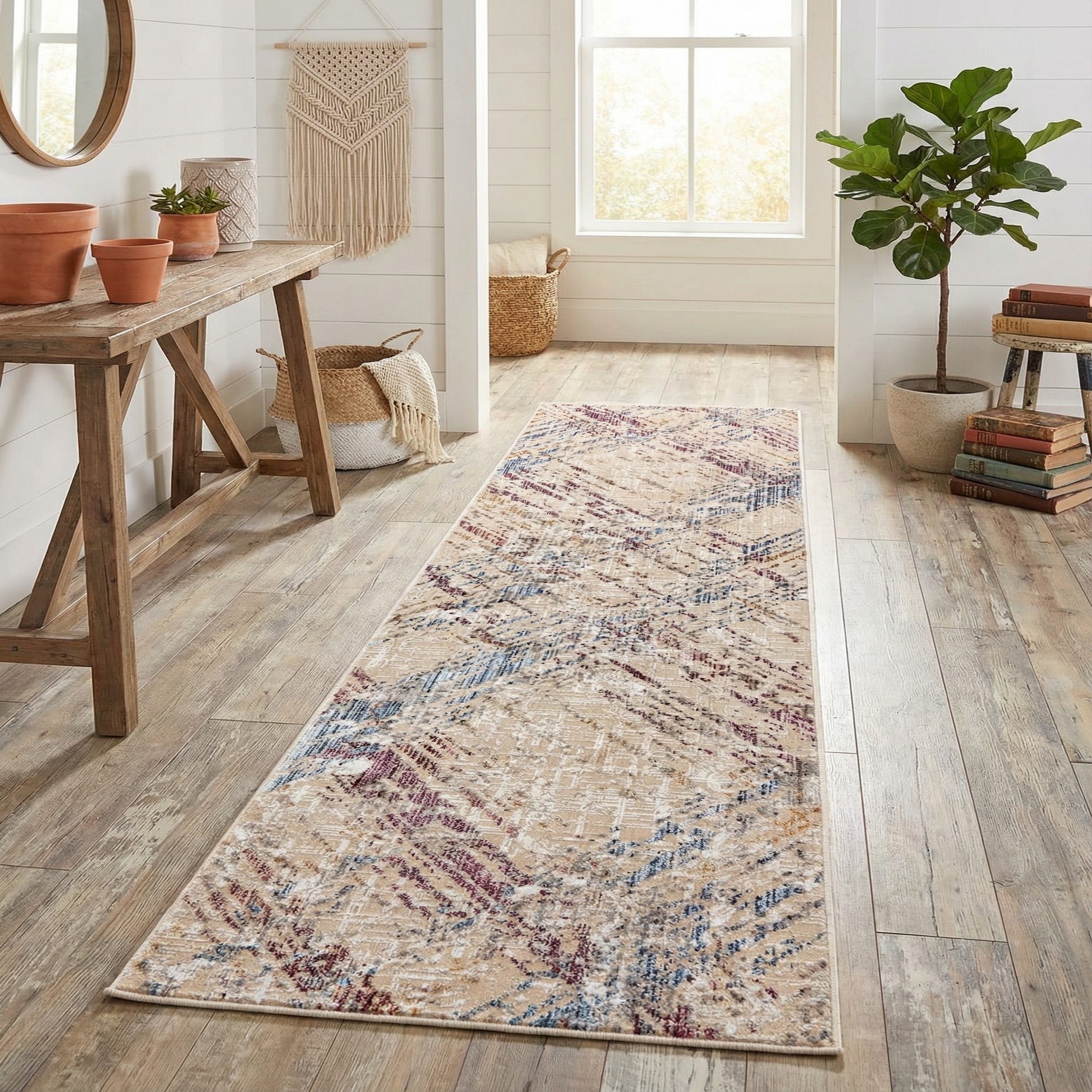 A soft, low-profile runner with an abstract, distressed geometric pattern that moves diagonally across its ivory-and-gray field. Layered strokes of beige, muted blue, gold and purple thread through faint lattice details, creating a sense of motion and depth without a busy look. The surface reads tactile—smooth underfoot with slight variations in pile height that catch the light and emphasize the woven-like texture.