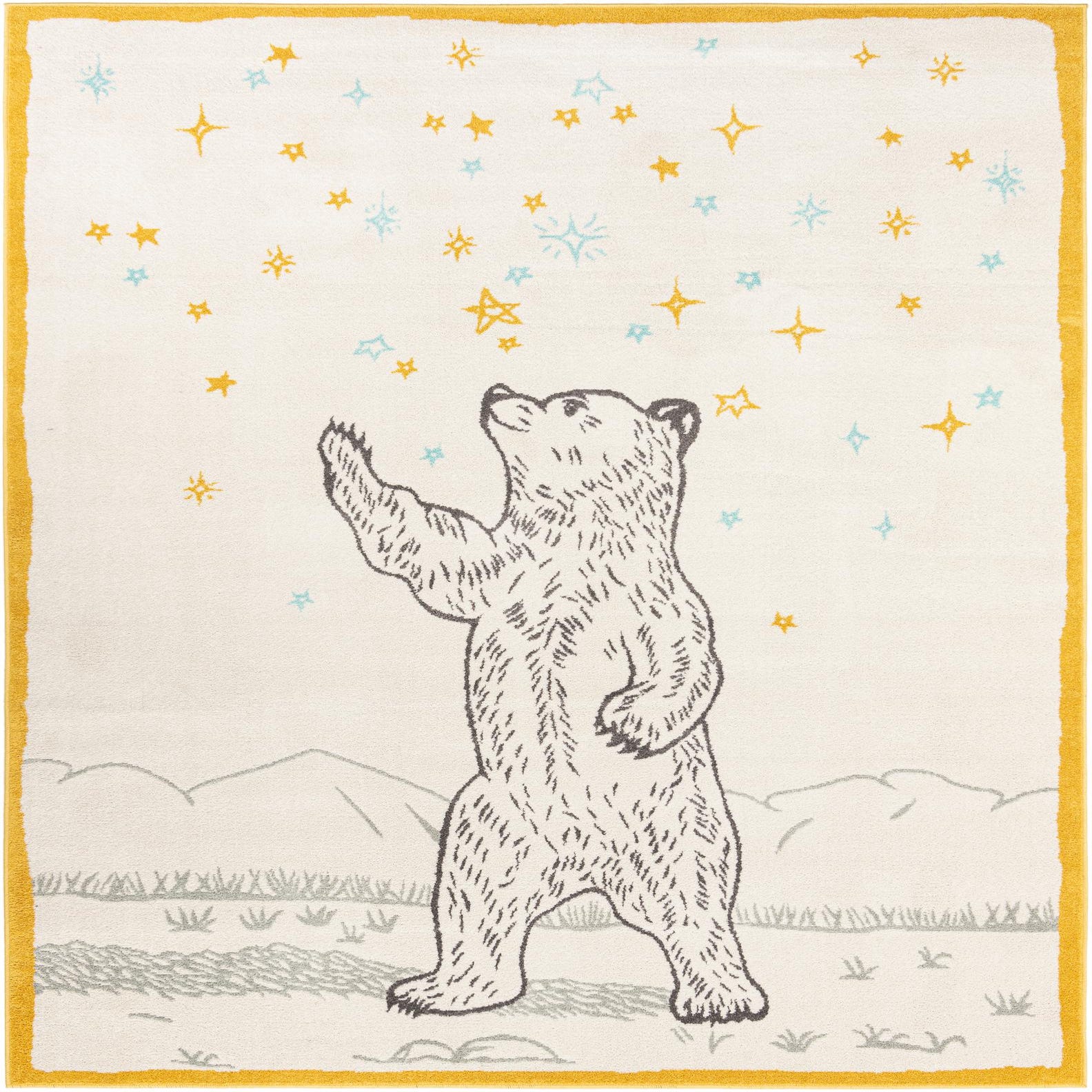A playful scene of a standing bear reaches up through a field of tiny, scattered stars on an Ivory and Gray background. Black linework gives the bear and sketch-style landscape clear, hand-drawn detail, while pops of Yellow and Navy Blue stars add bright contrast and visual interest. A narrow Yellow border frames the design, keeping the composition neat and grounded. Made from 100% polypropylene, the rug has a soft, low-profile pile that feels comfortable underfoot and lays flat for easy placement.