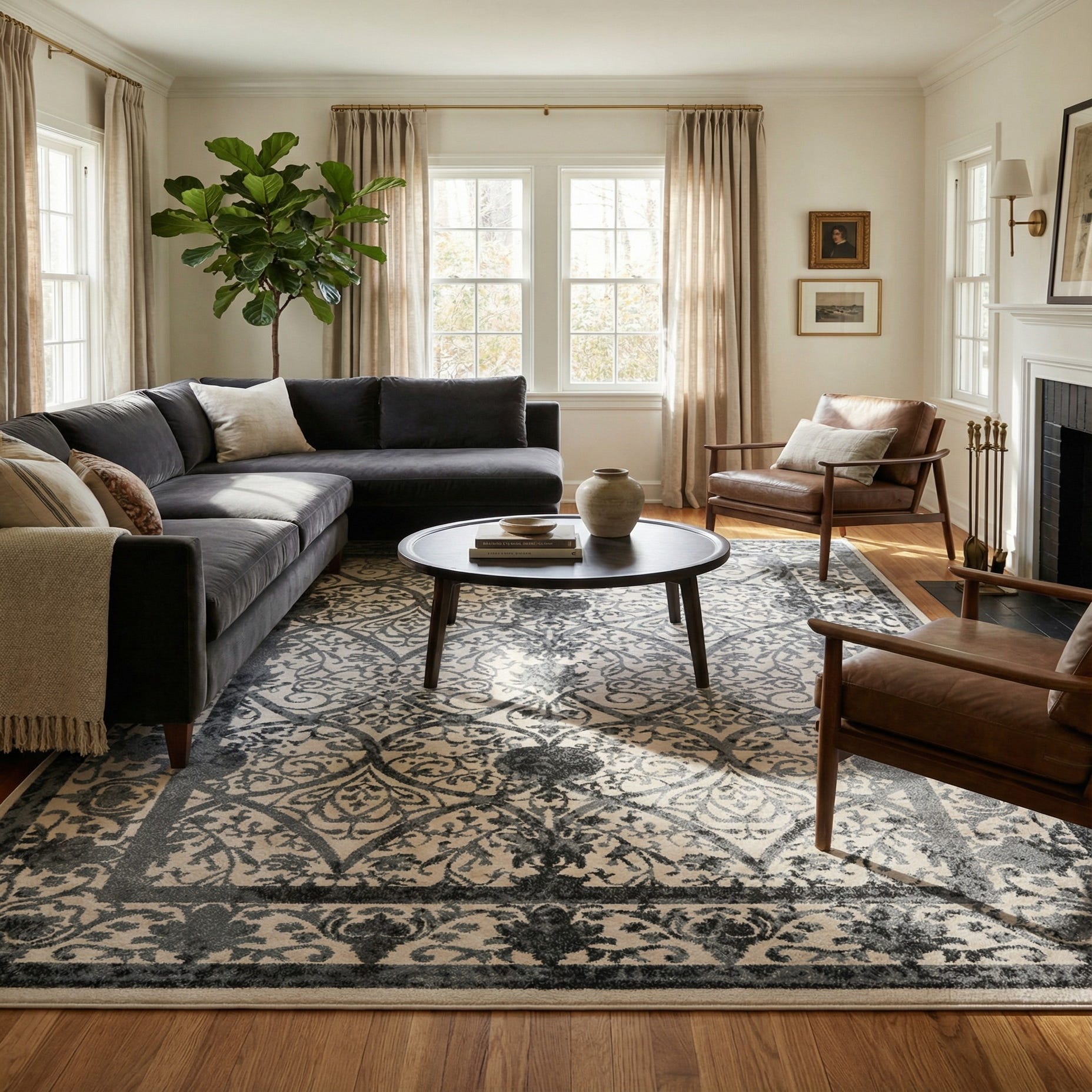 This rug fits well in transitional and traditional settings as well as more modern spaces that favor a neutral palette—use it to anchor a living room seating group, place it beneath a dining table, or layer it in a bedroom for added pattern and texture. Pair it with warm woods and soft gray upholstery for a cohesive look, or let it provide calm contrast against darker furnishings and metal accents.