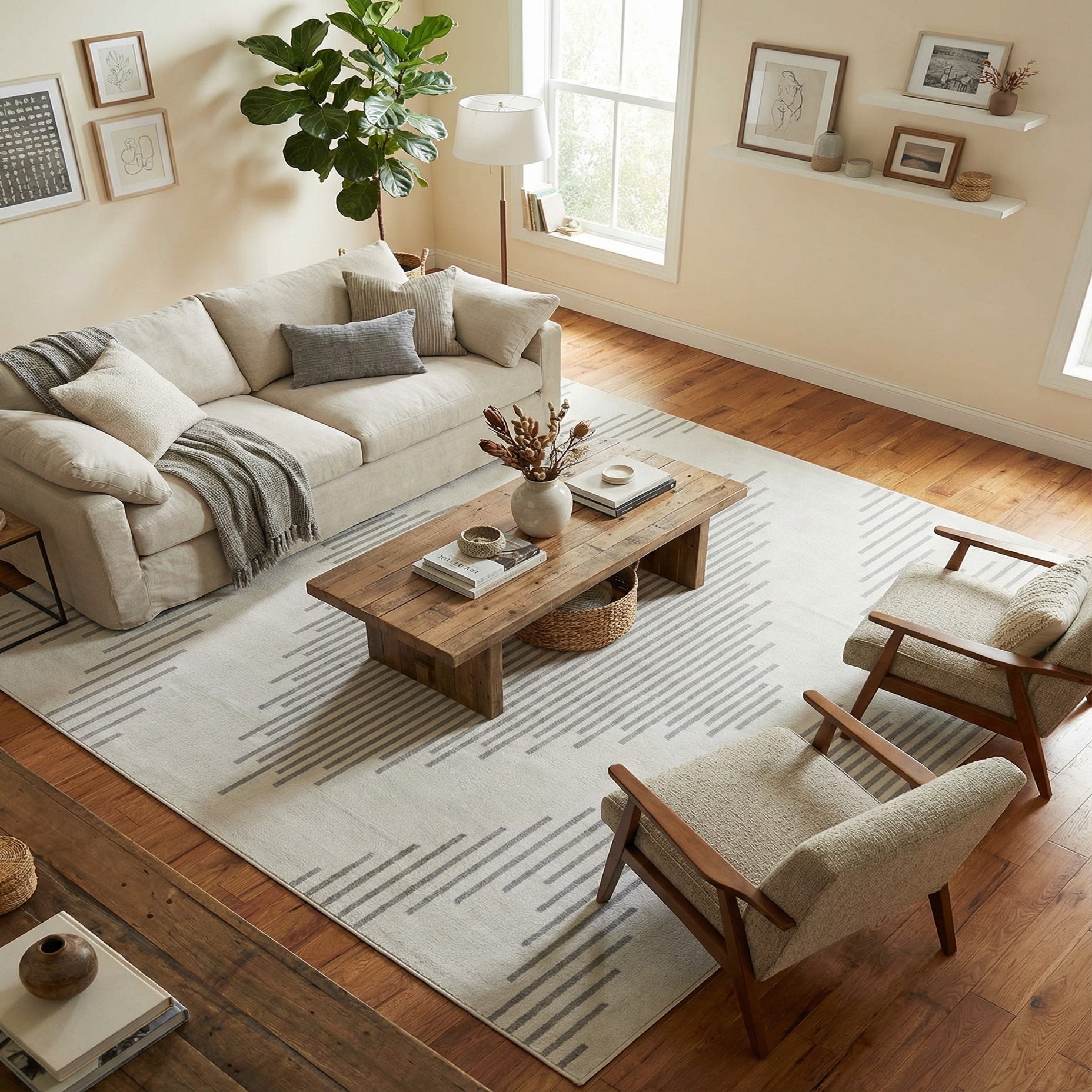 This piece works well where you want a restrained, modern anchor: beneath a sofa grouping in a living room, layered under a simple dining table, or placed at the foot of a bed to soften a neutral bedroom. Pair it with light wood or painted furniture, linen upholstery, and metal or glass accents for a Scandinavian or contemporary look, or use it to balance mid-century pieces in a transitional setting. Its muted palette and geometric pattern let other textures and colors in the room stand out while adding a quiet, tailored presence to the space.