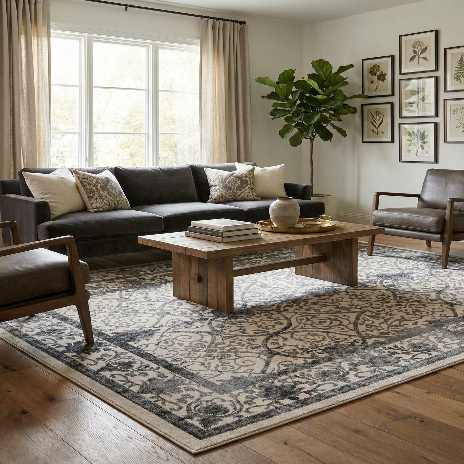 This rug fits a range of interiors: it grounds a neutral living room beneath a sofa and coffee table, anchors a dining area where patterned detail can complement simple tabletop pieces, or layers under a bed to add pattern without heavy color. It pairs nicely with warm wood furniture, cool gray upholstery, leather seating or light linens, and works particularly well in traditional, transitional and modern farmhouse schemes as well as contemporary spaces that benefit from a soft, patterned focal point.