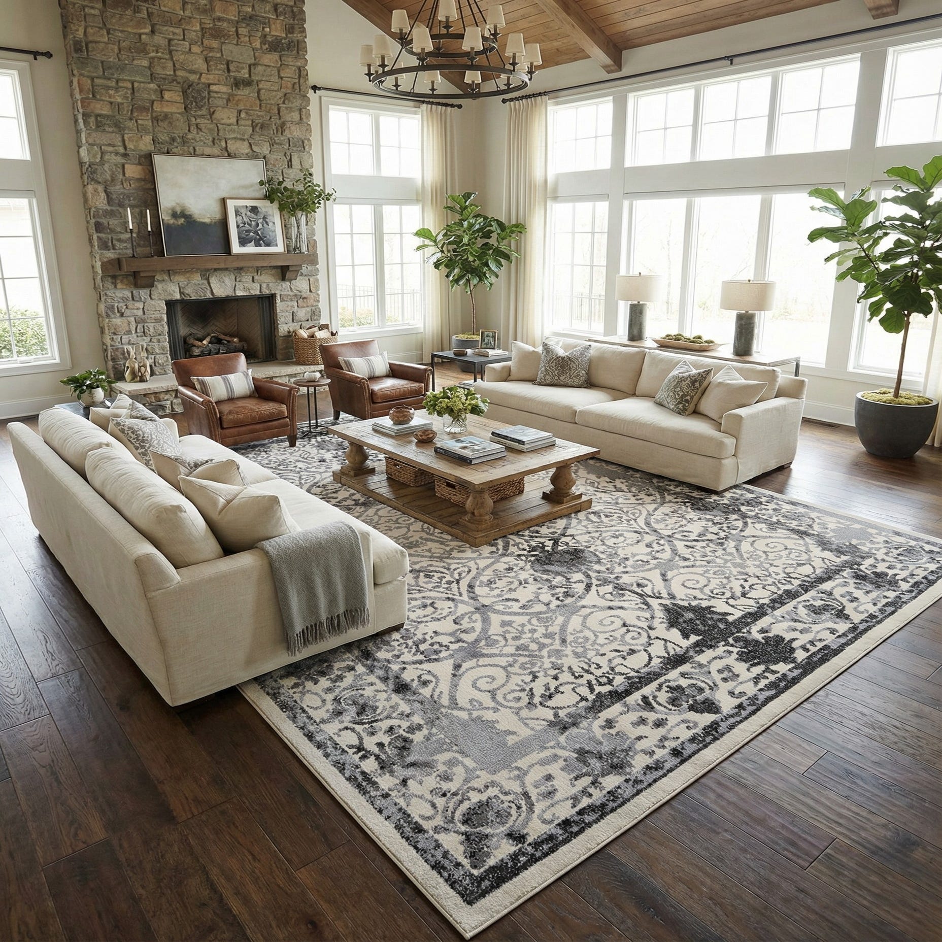 This piece works well in transitional or traditional settings and pairs easily with both warm wood finishes and cool metal accents. Use it to anchor a living room seating area or beneath a dining table for a refined, grounded look, or layer it at the foot of a bed to add pattern without overwhelming the space. Its neutral ivory-and-gray backdrop makes it a flexible choice for rooms that need a calm, textural foundation.