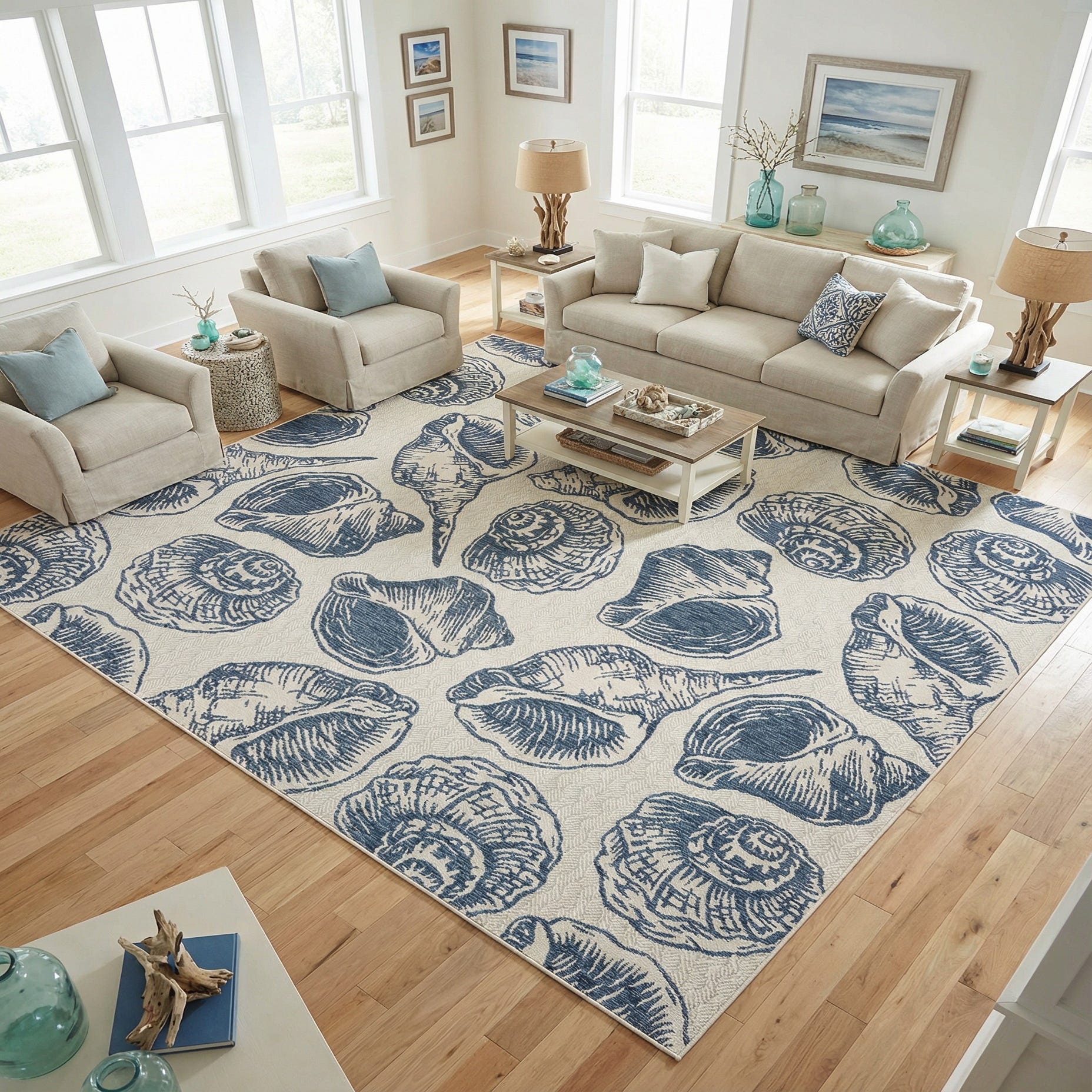 In terms of design scenarios, this Outdoor Coastal rug would pair exceptionally well with wicker or wooden furniture, adding a layer of visual interest to minimalist or rustic decors. Its coastal theme complements spaces accented with natural materials and light, breezy color schemes. It can also serve as an inviting foundation for a laid-back, seaside-inspired entertainment area on a deck, patio, or within a sun-drenched conservatory.