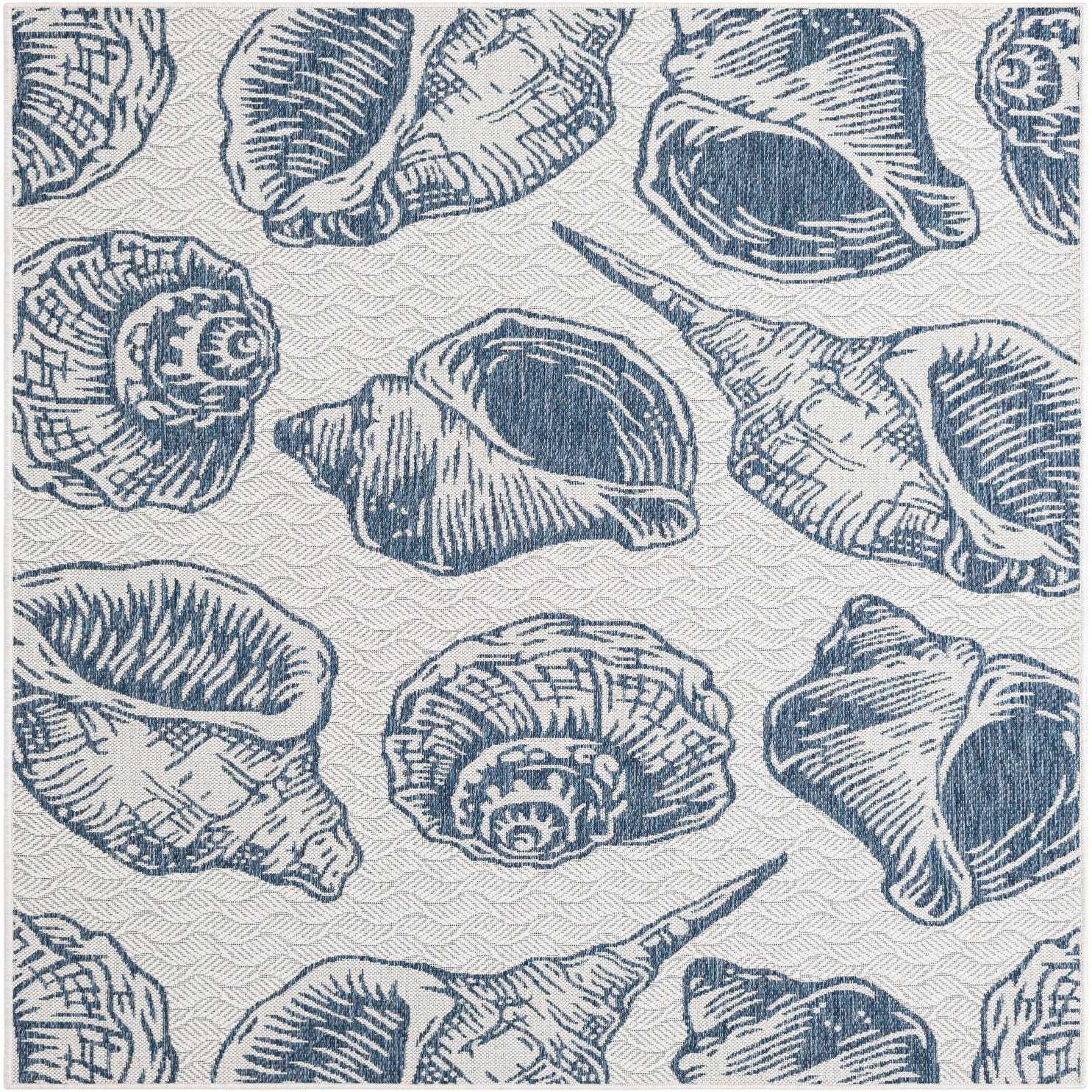 A 5x7 rectangular indoor/outdoor rug featuring an array of blue and ivory seashell patterns on a textured flatweave.