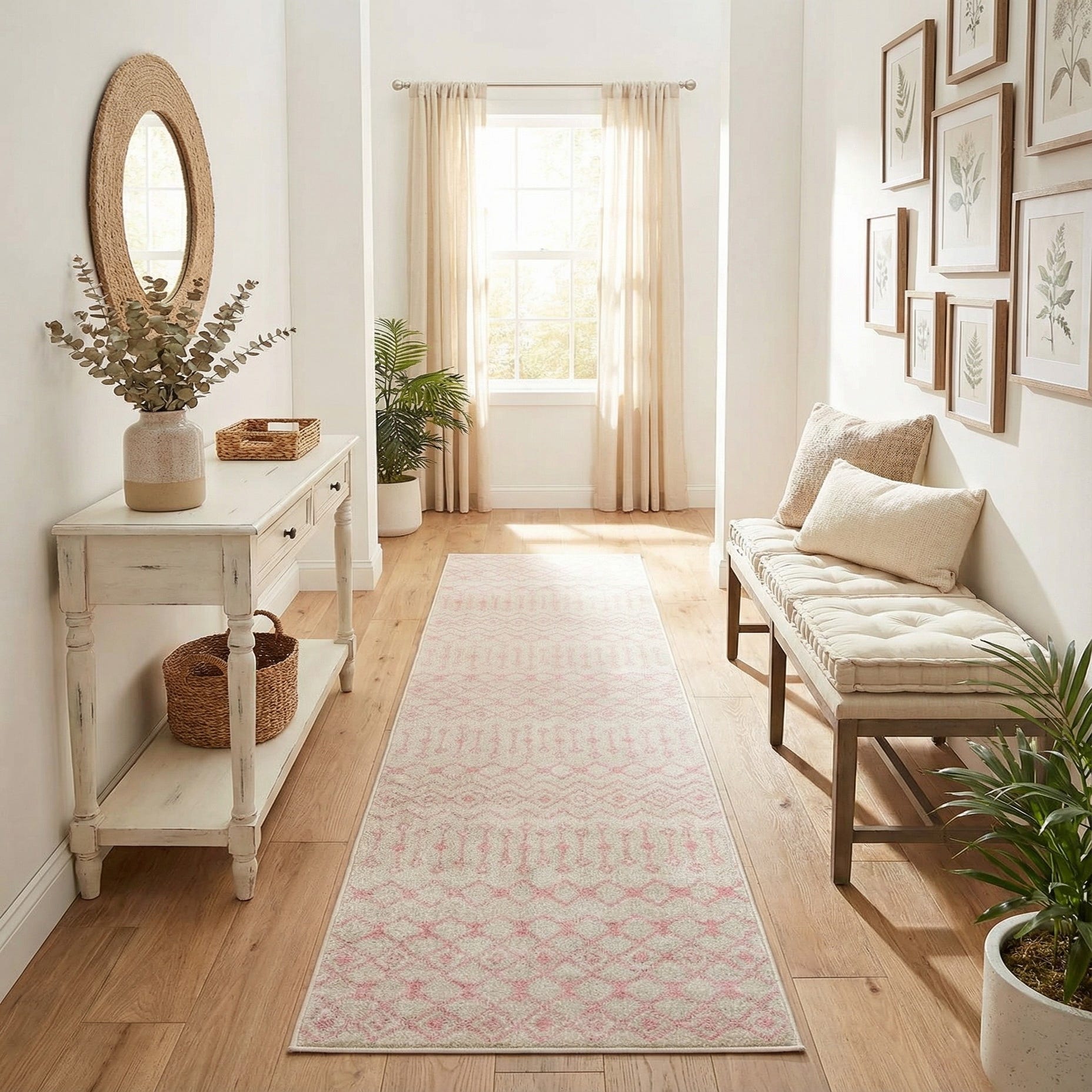 A 10 ft runner rug in ivory with a pink Moroccan trellis and tribal pattern, ideal for a hallway.