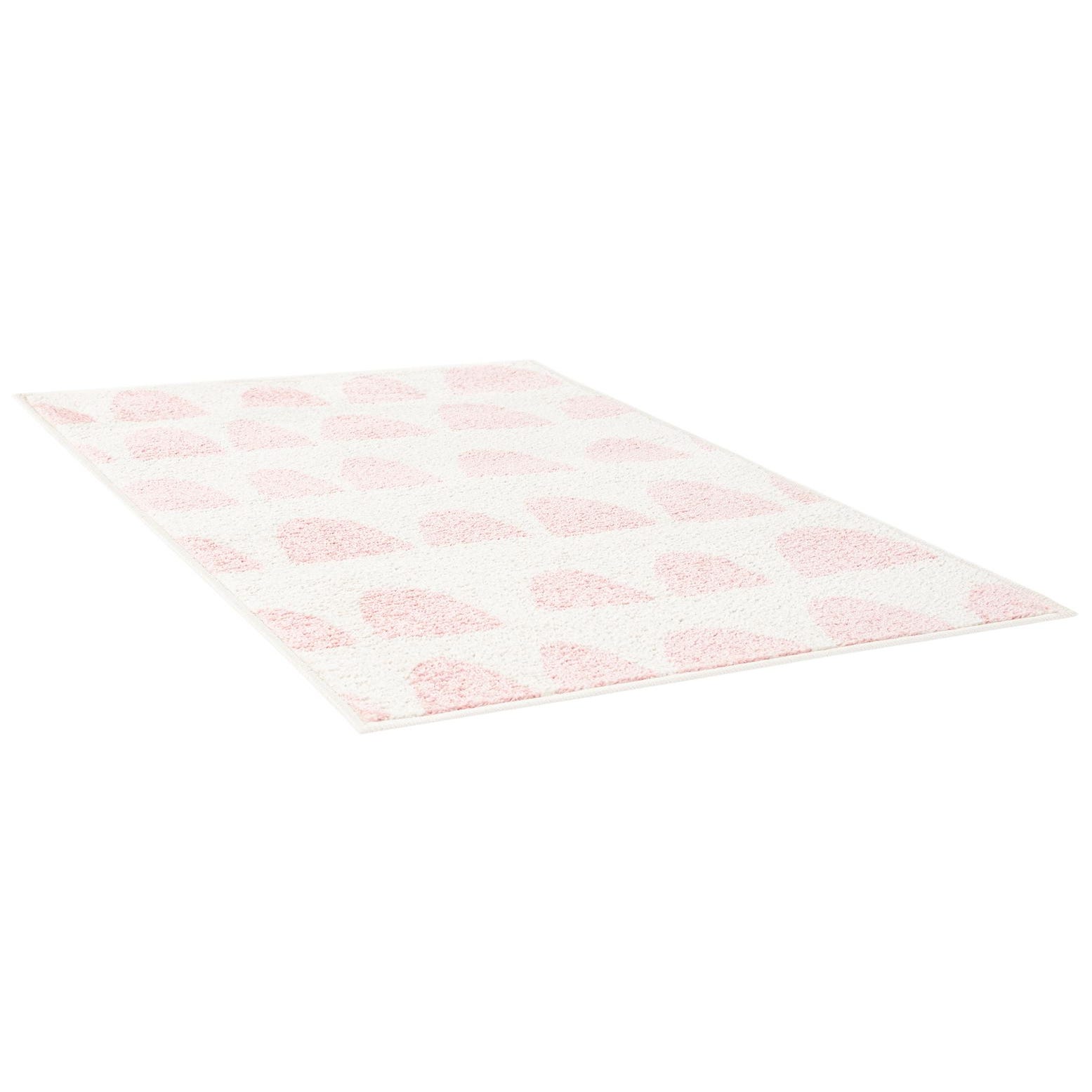 A 2x3 rectangular ivory rug with a modern abstract pattern of light pink half-circle shapes, ideal for a kids' room.