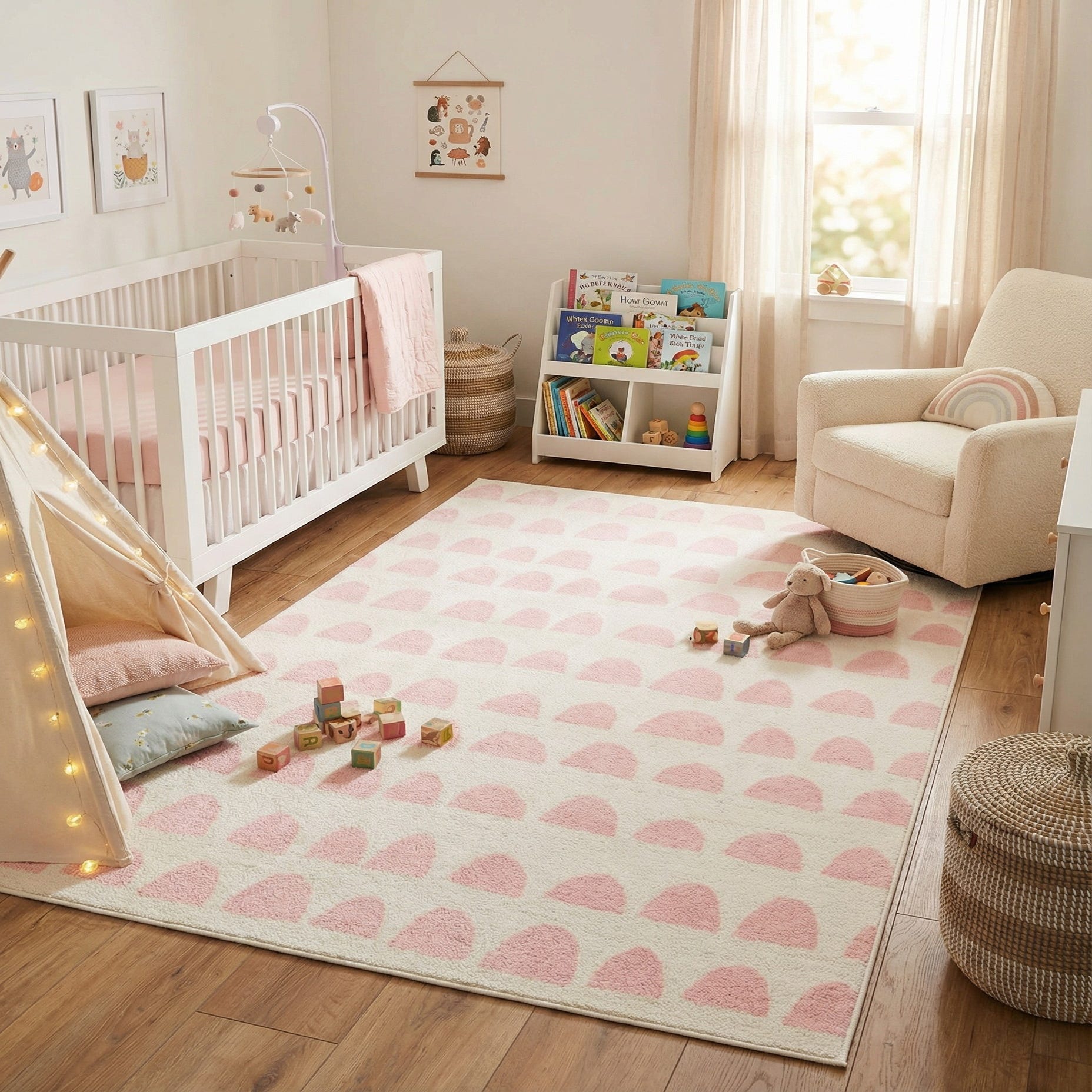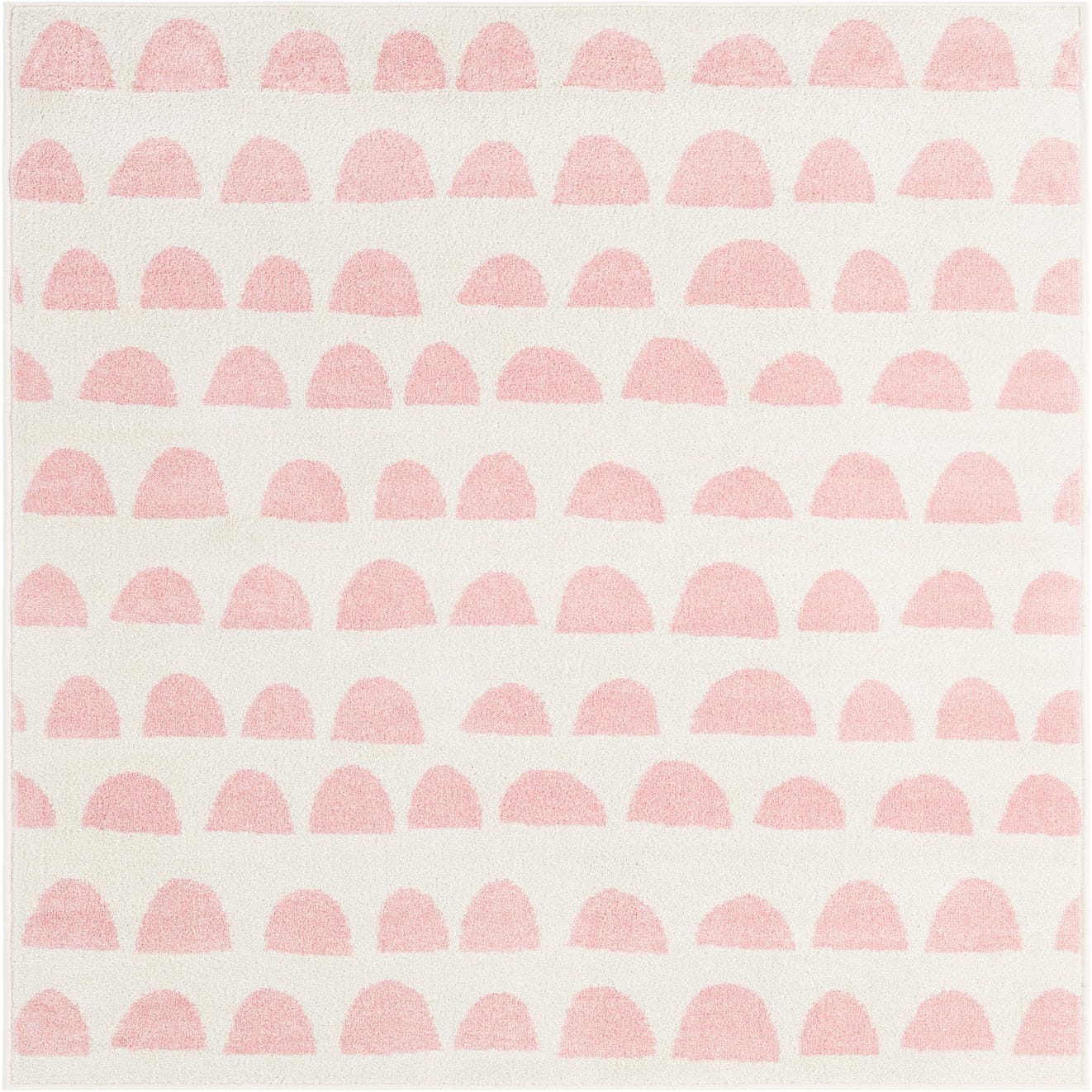 A 4x6 rectangular ivory rug with a modern abstract pattern of light pink half-circle shapes arranged in rows.
