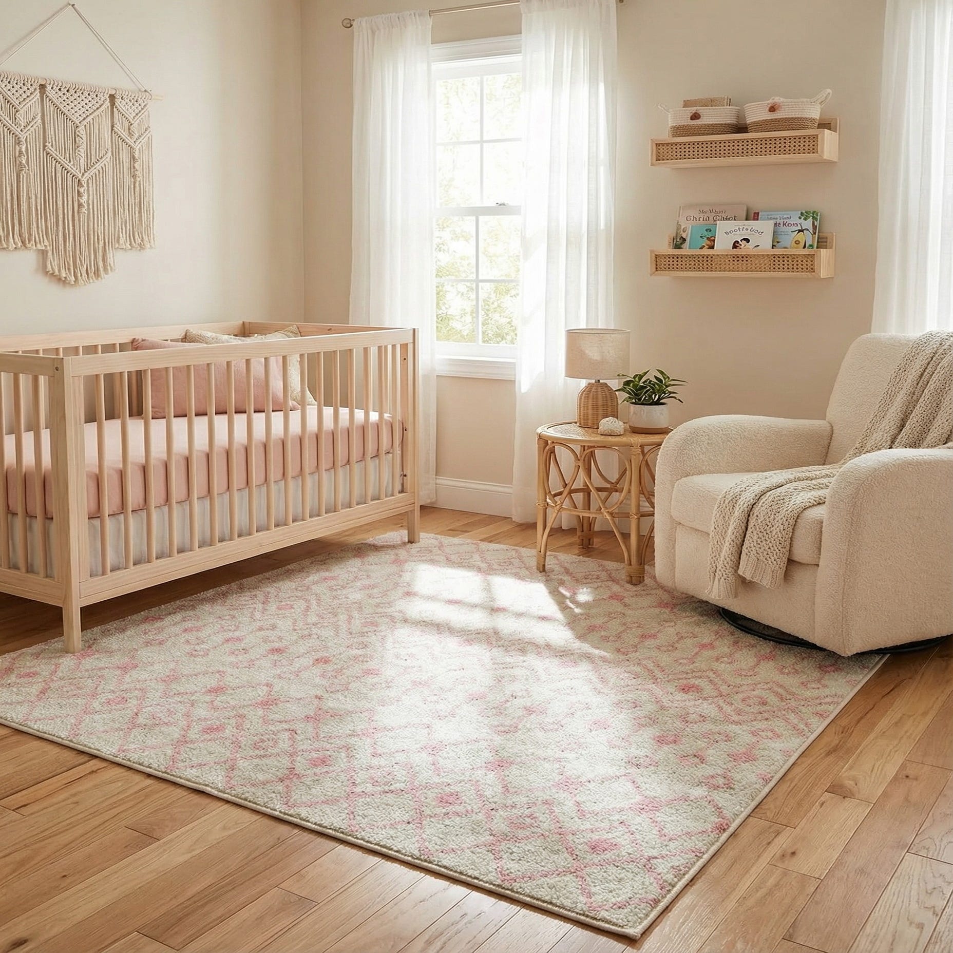 Soft ivory provides a light, neutral field for a repeating trellis pattern worked in gentle pink. Rows of linked diamonds alternate with vertical chainlike motifs and small medallion dots, creating a balanced, geometric layout that reads both modern and relaxed. The cut pile is low-to-medium and plush to the touch, with the pink motifs slightly raised so you can feel the pattern under your hand; the machine-made polypropylene weave gives the surface an even, consistent texture and a faint, satiny sheen.