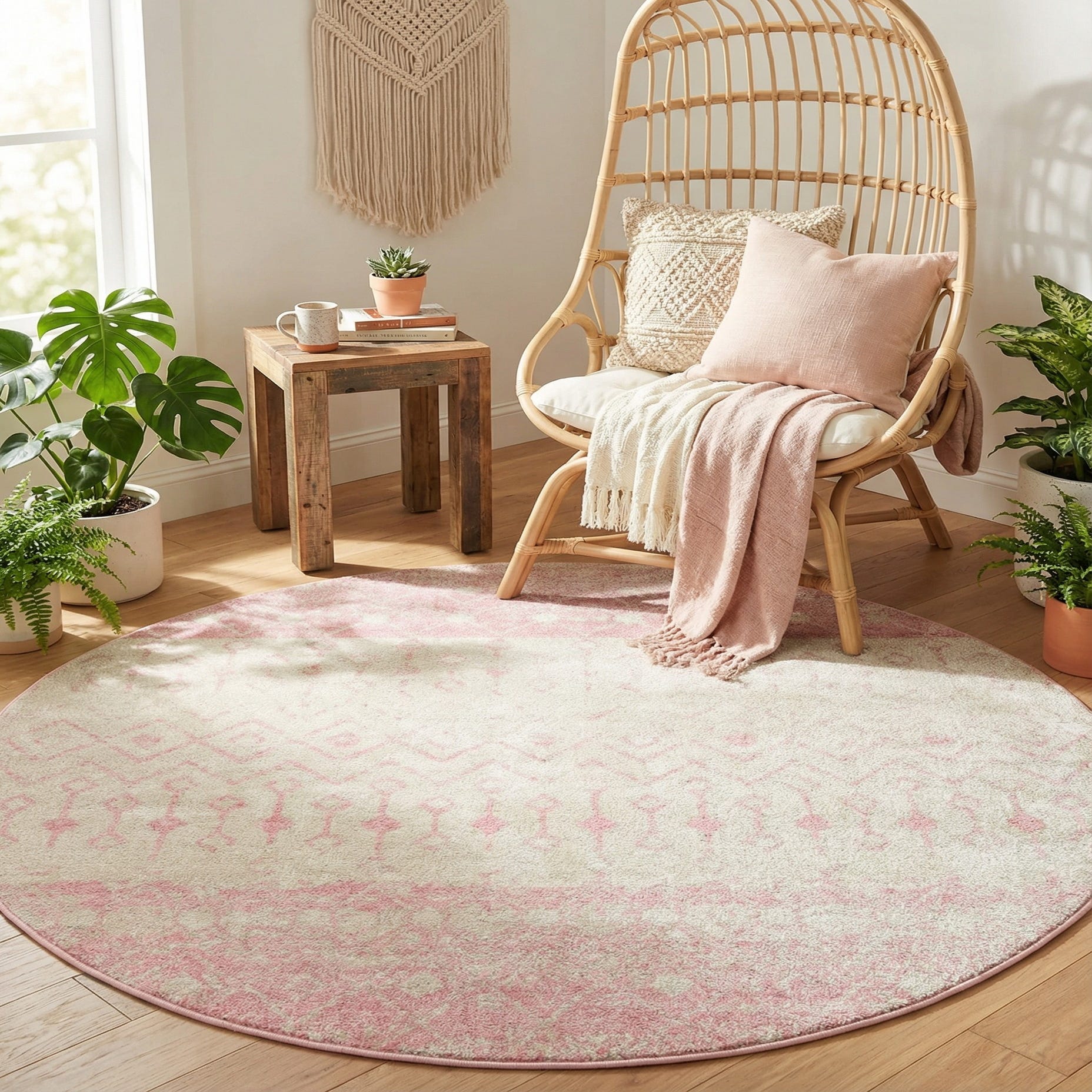 Use this round rug to anchor a cozy reading nook or to soften the center of a bedroom or nursery; it also works well beneath a circular coffee table or in an entryway to introduce a touch of blush without overwhelming the room. It pairs nicely with light woods and white-painted furniture, woven rattan or wicker accents, and neutral linens—an easy choice for Scandinavian, cottage, boho, or softly modern interiors.