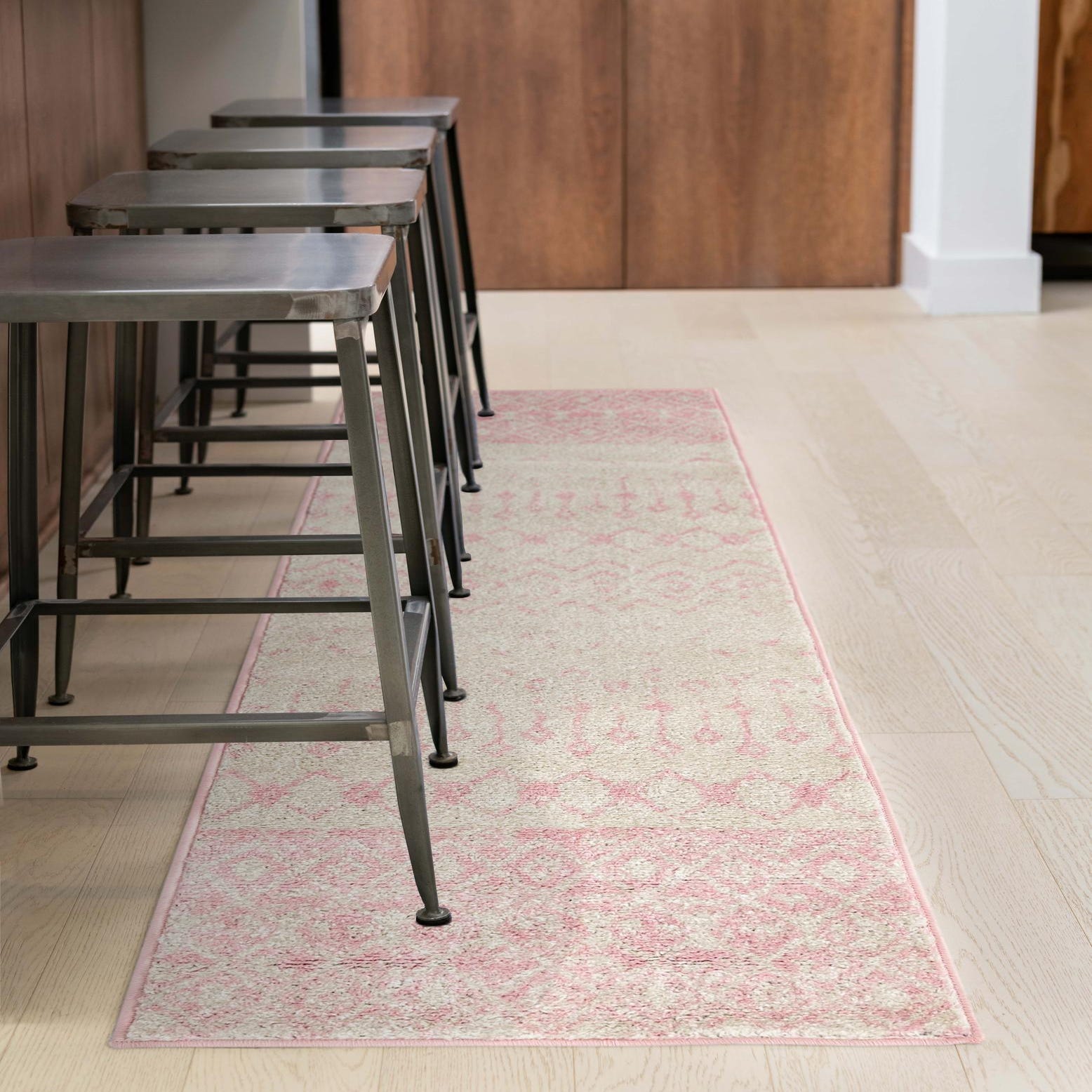 A 6 ft runner rug with a cream background and pink bohemian trellis patterns, ideal for a hallway or kitchen.