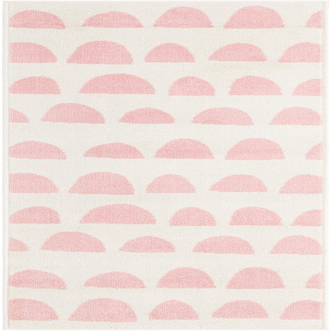 A 6 ft runner rug with a modern abstract pattern of light pink half-circles on an ivory background.