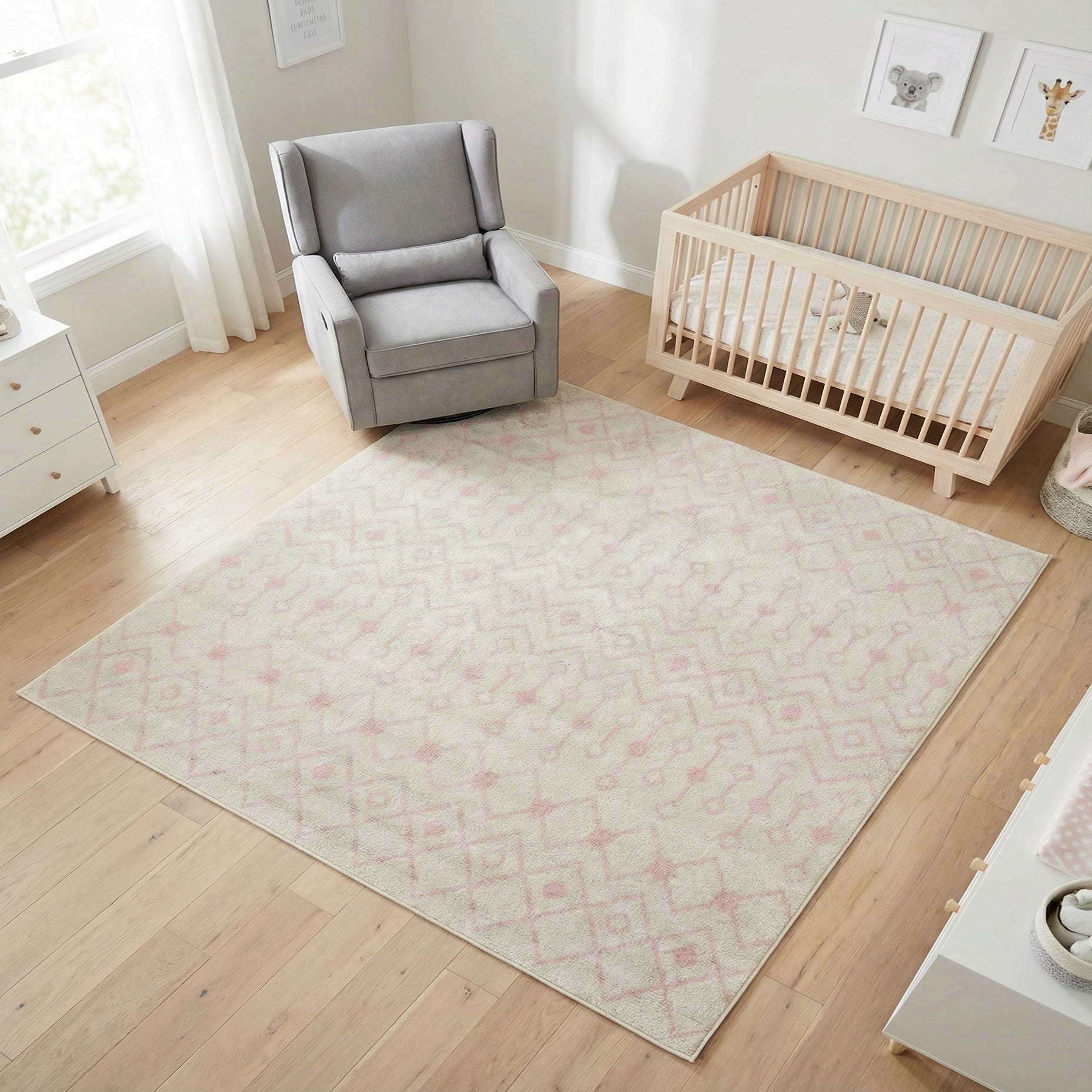 This piece works well in a light-filled bedroom or nursery where the soft pink and ivory palette can anchor pale woods, white painted furniture, or linen upholstery. It also fits nicely into Scandinavian, coastal, or modern-traditional schemes—place it under a coffee table to define a seating area or layer it in a reading nook to add subtle pattern and warmth.