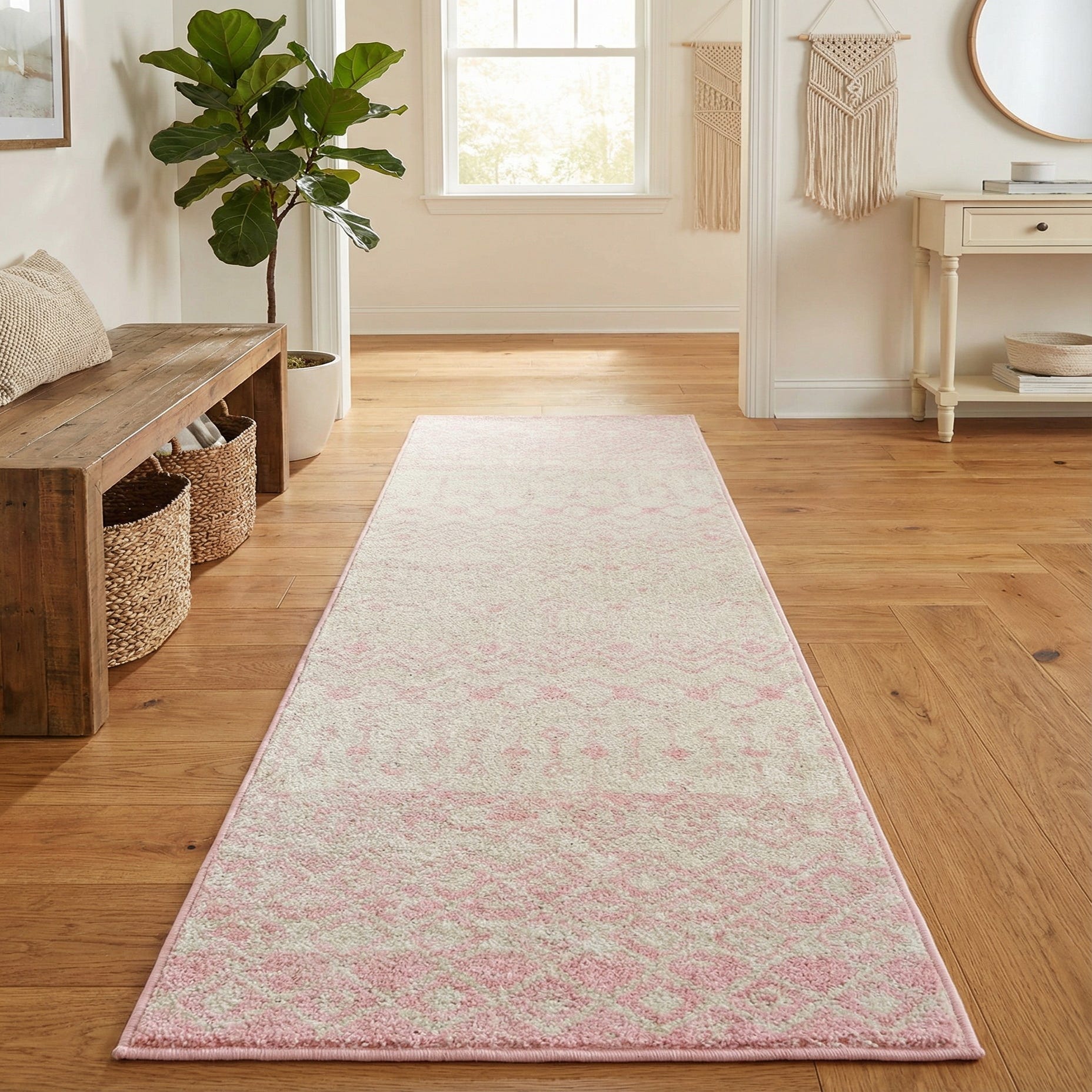 Soft pink motifs float across an ivory field in a subtle Moroccan-inspired trellis and medallion pattern that feels both familiar and fresh. Bands of more concentrated pattern at the ends balance a more open central area, creating a gentle, rhythmic look that adds visual interest without overwhelming a space. The two-tone palette keeps the design light and airy, letting furniture and linens take center stage.