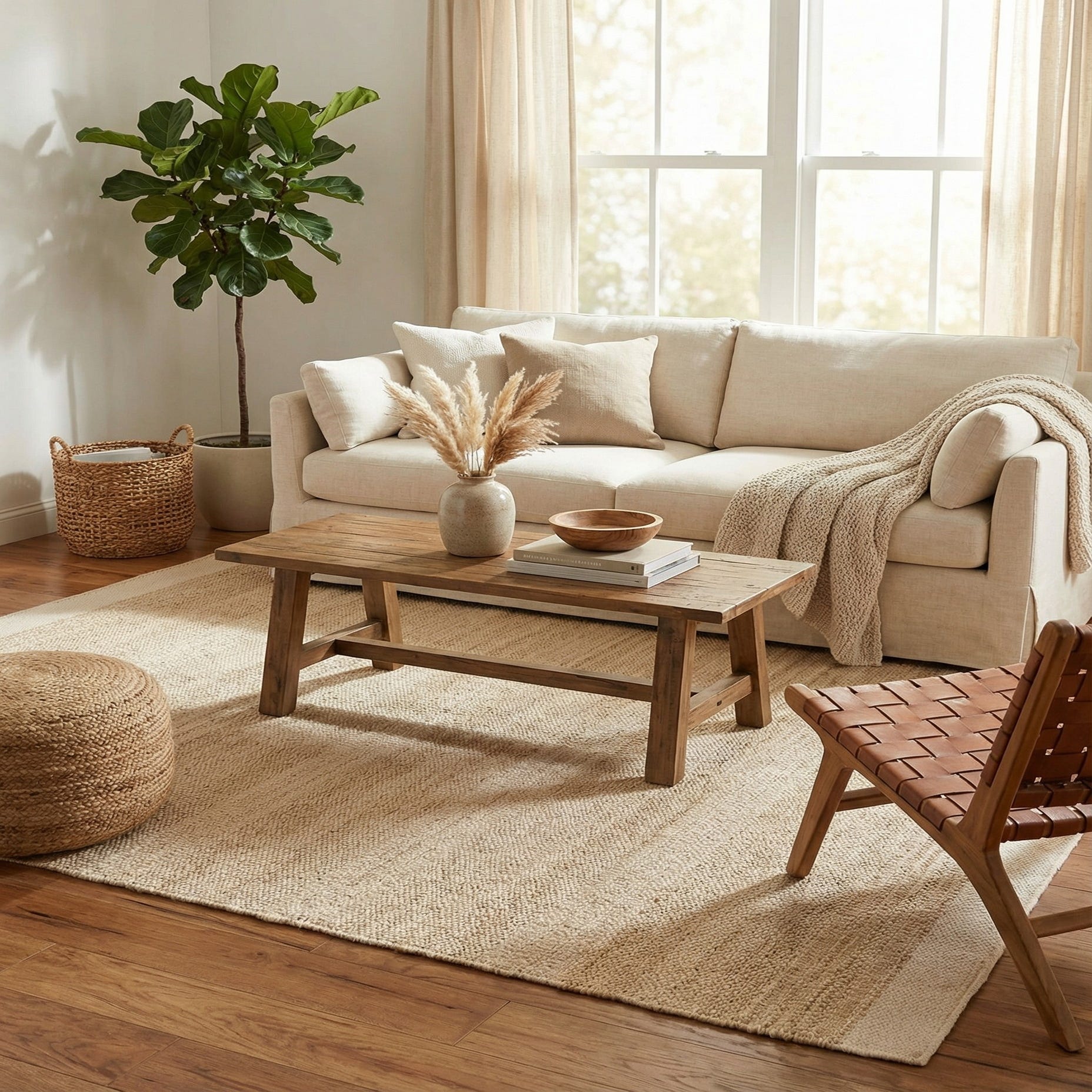 This neutral palette and straightforward pattern work well in a range of interiors — place it under a coffee table in a light-filled living room, layer it beneath a dining table to warm a casual farmhouse setting, or use it in a bedroom to anchor linens and natural wood furniture. It pairs especially well with rattan or oak pieces, linen upholstery, and a restrained neutral scheme when you want a calm, textural foundation.
